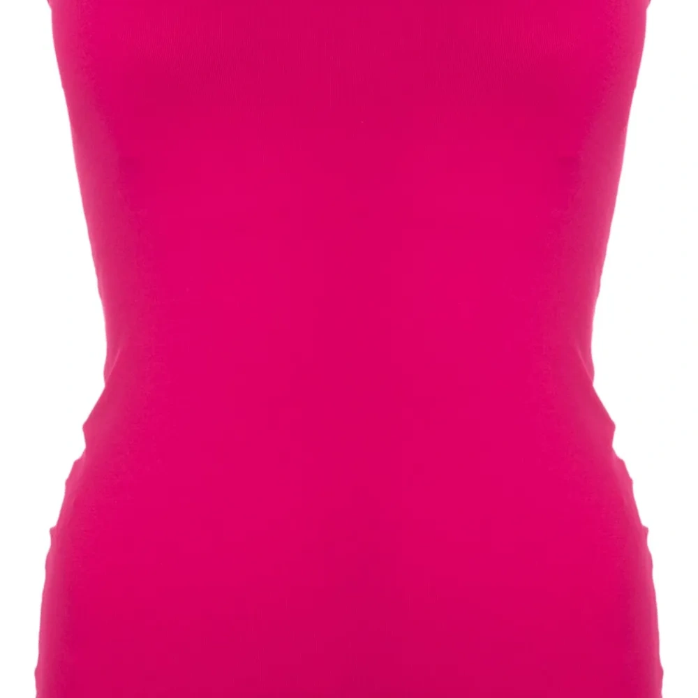 Фуксия, эластичный материал, без бретелей, без рукавов и прямой подол.