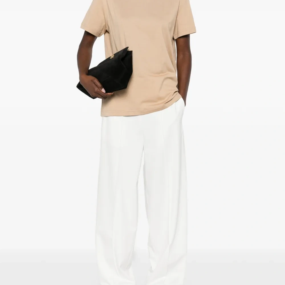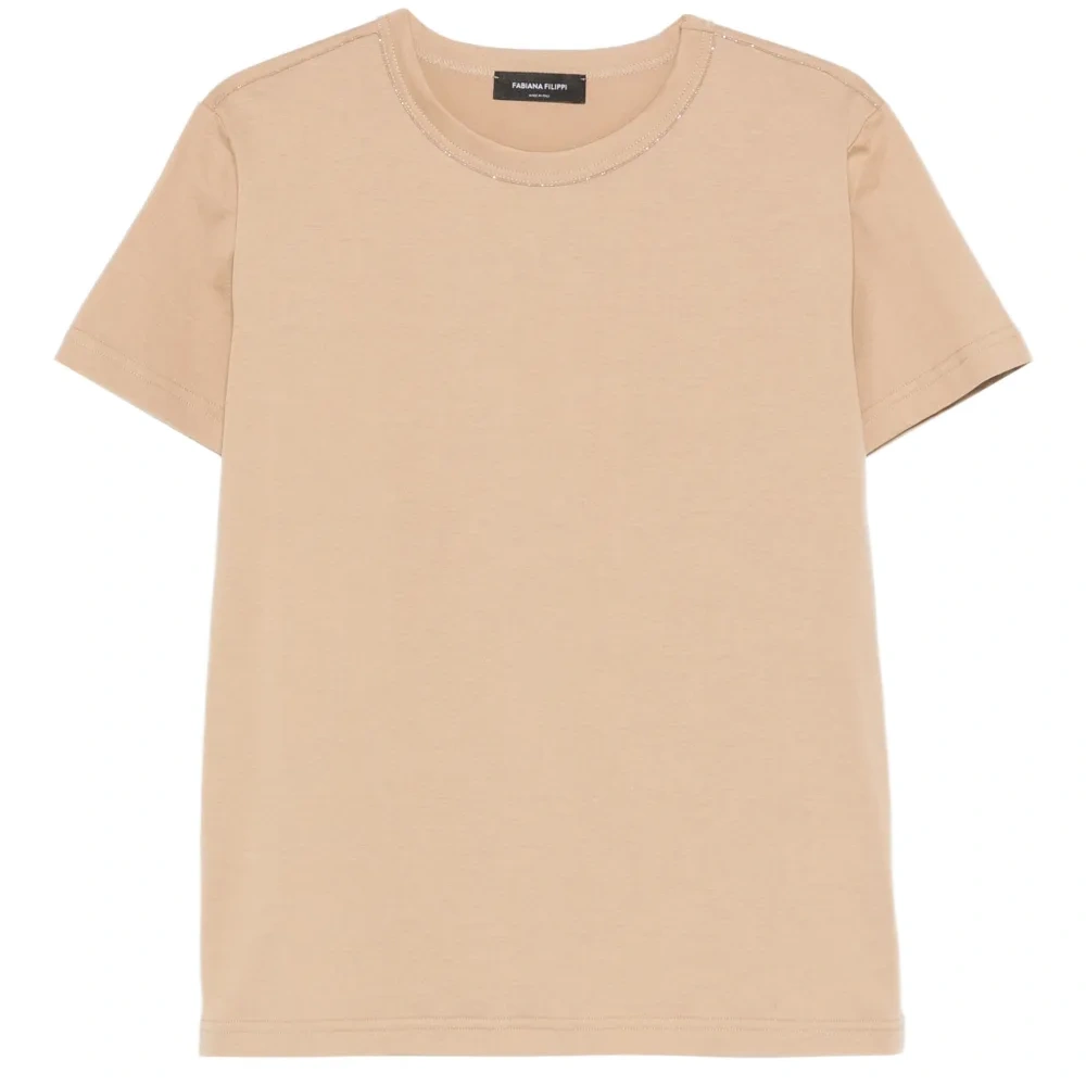 светло-коричневая футболка с круглым вырезом, короткими рукавами и тональной отделкой строчкой