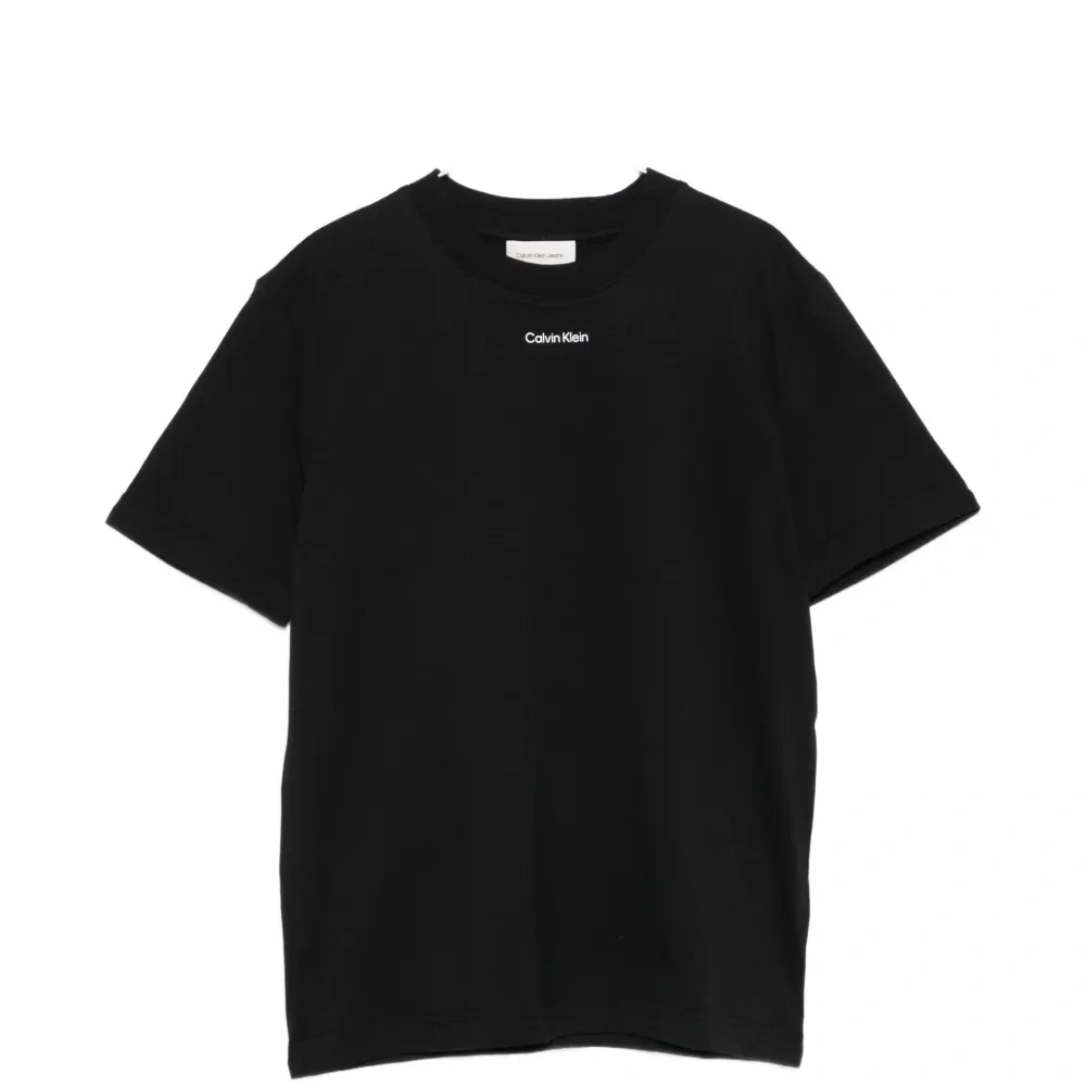 чёрная футболка с принтом логотипа, круглым вырезом и короткими рукавами
