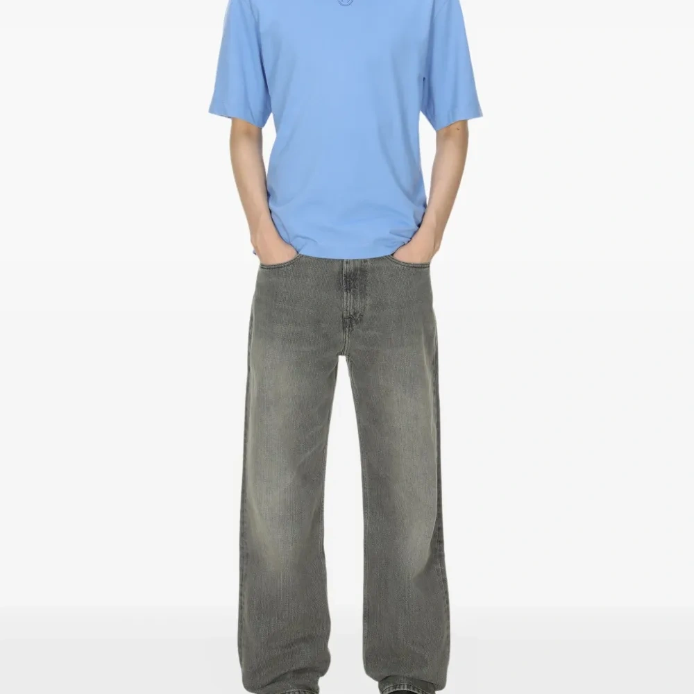 голубая хлопковая футболка с короткими рукавами, круглым вырезом и вышитым логотипом