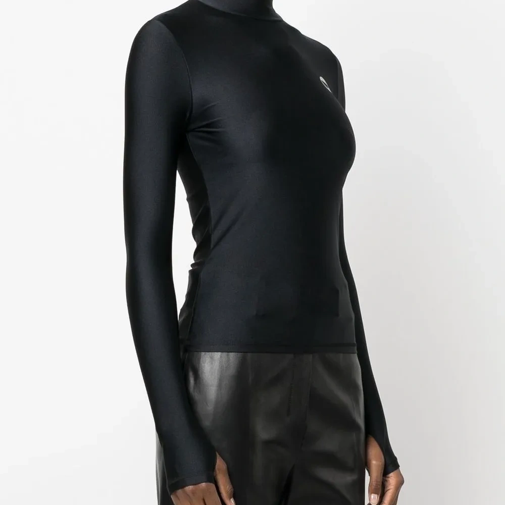 Эластичный материал, принт с логотипом на груди, высокий воротник, длинные рукава и прямой подол.