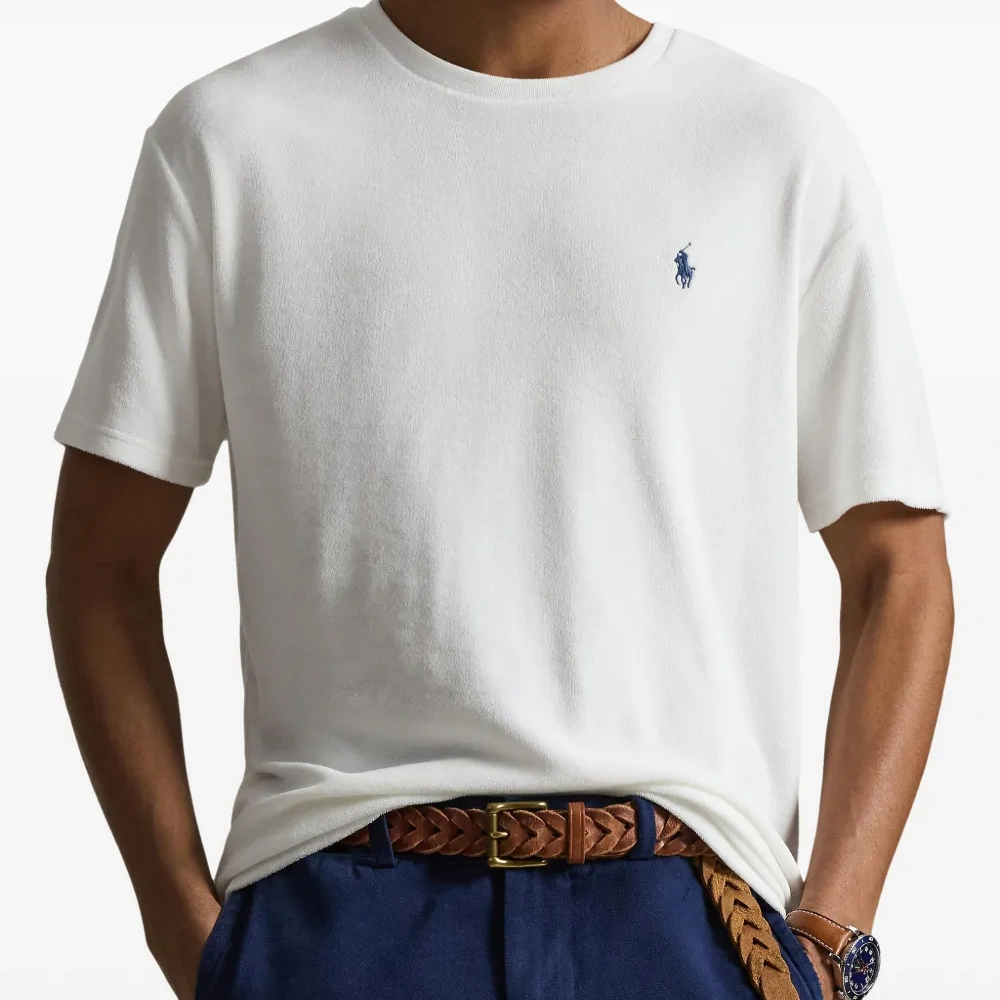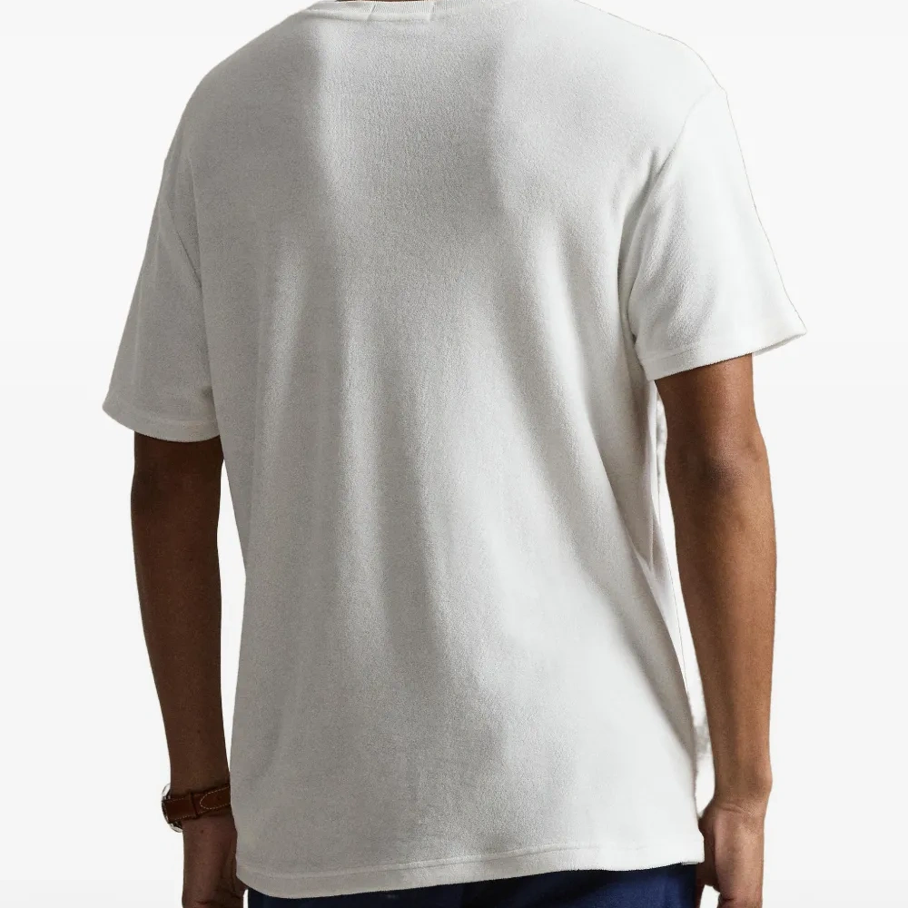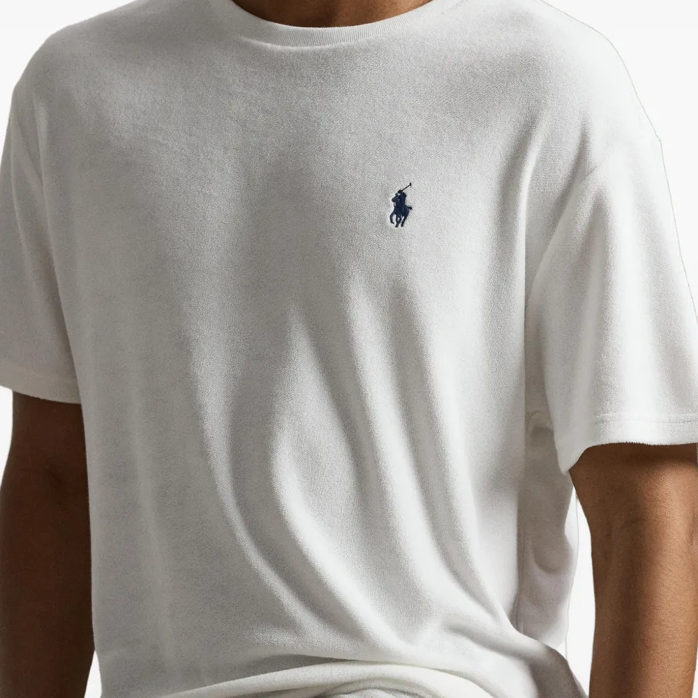 белая футболка с логотипом, короткими рукавами и круглым вырезом