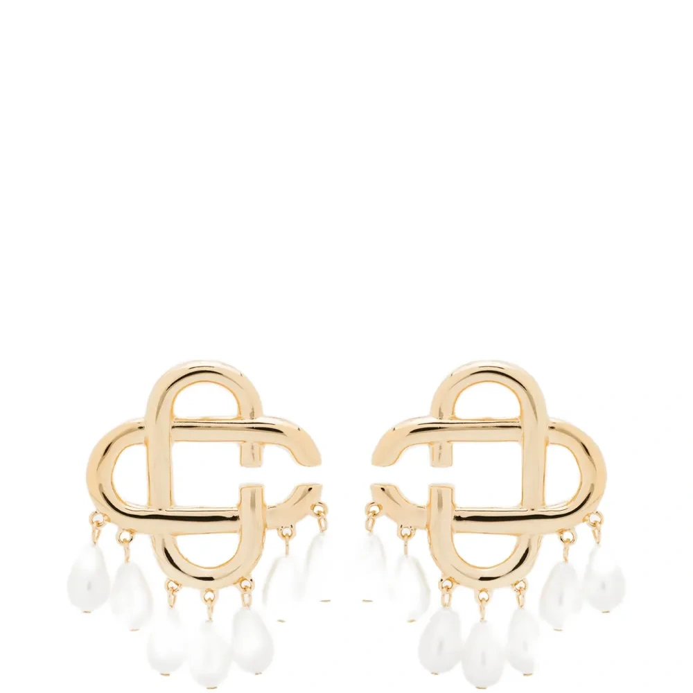 Серьги с золотистым покрытием, с дизайном в виде логотипа, украшены жемчужными подвесками, застёжка типа "бабочка". Жемчуг следует надевать последним утром и снимать первым вечером. Избегайте контакта с духами и кремами; для очистки просто протрите мягкой тканью. Обычное ежедневное использование и внешние факторы могут снизить блеск драгоценных камней и золотых поверхностей. Для ухода используйте специальные неабразивные средства, предназначенные для чистки ювелирных изделий. Эти серьги поставляются в паре.
