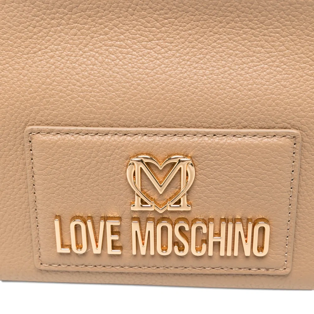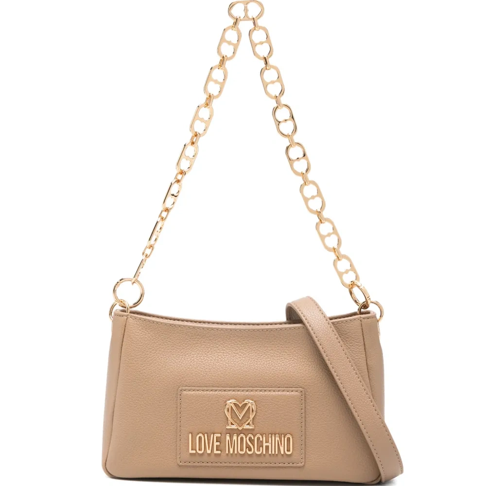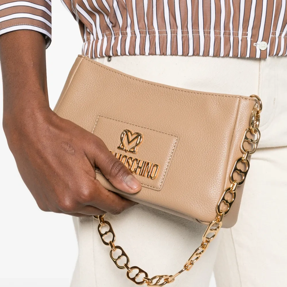 бежевый цвет, зернистая фактура, цепочка золотистого оттенка, крупная эмблема с логотипом, застёжка на молнии сверху, съемный плечевой ремень. В комплекте идет защитный мешочек для хранения.