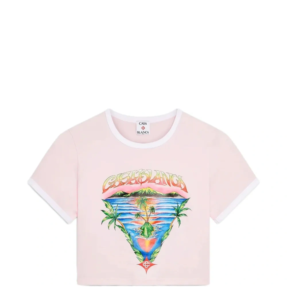 розовая футболка с графическим принтом, круглым вырезом, короткими рукавами и контрастной отделкой
