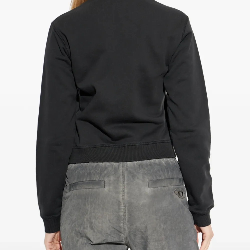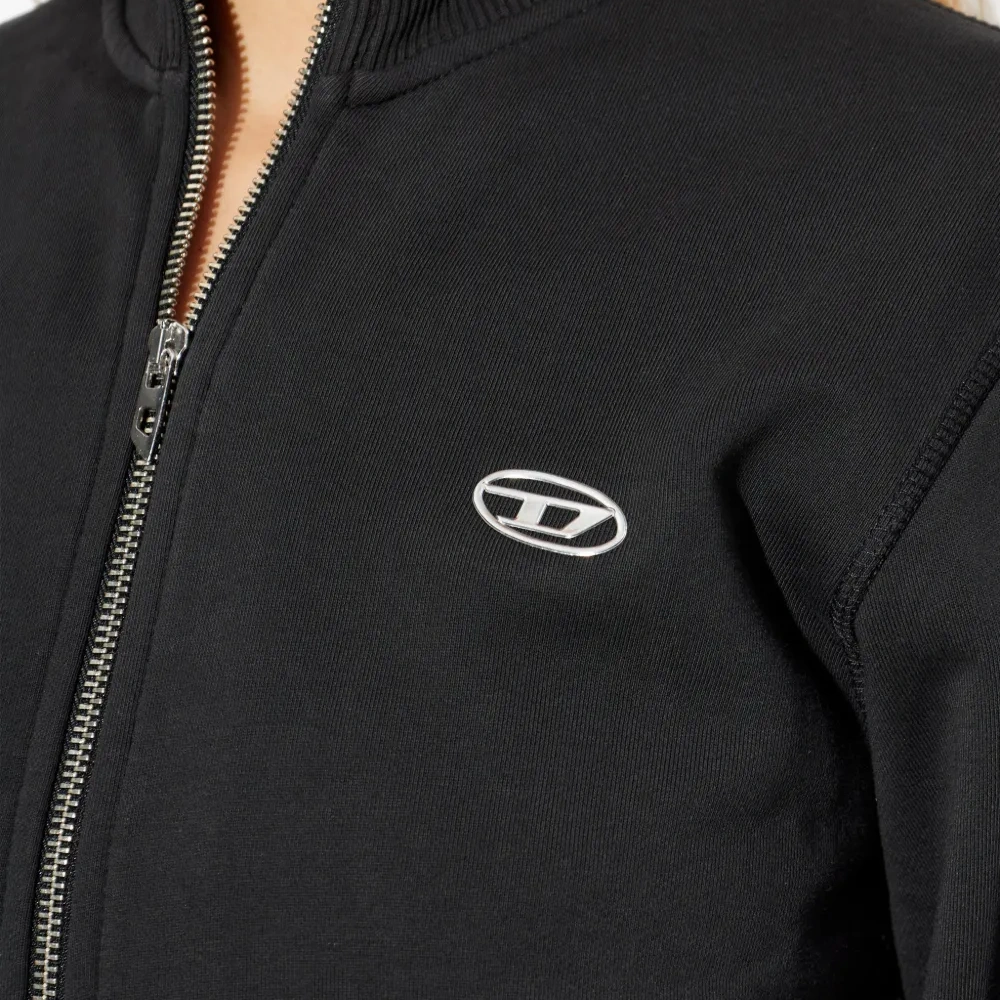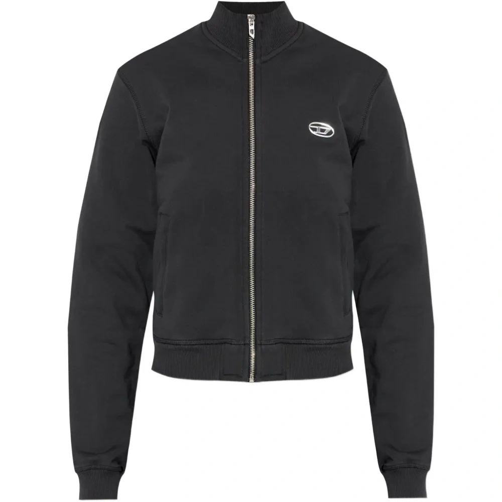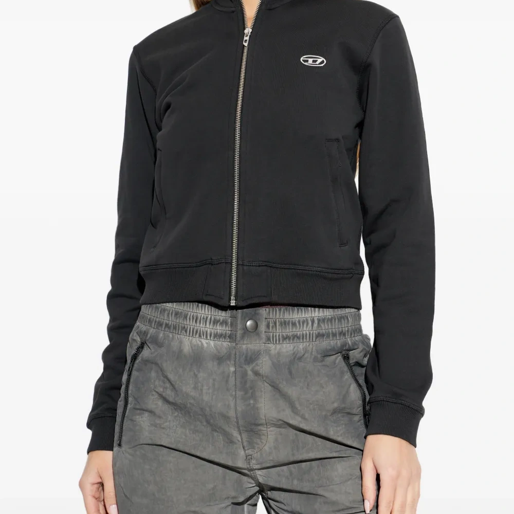 черная куртка с логотипом, застежкой-молнией, высоким воротником, длинными рукавами и ребристым подолом