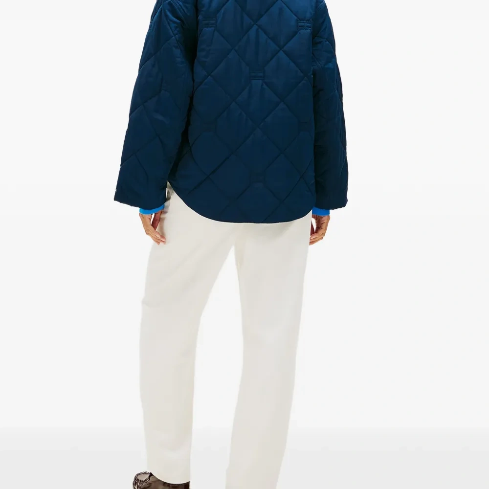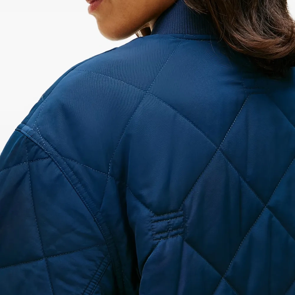 синяя стеганая куртка с алмазным узором, застежка на молнию, круглый вырез, длинные рукава, прорезные карманы