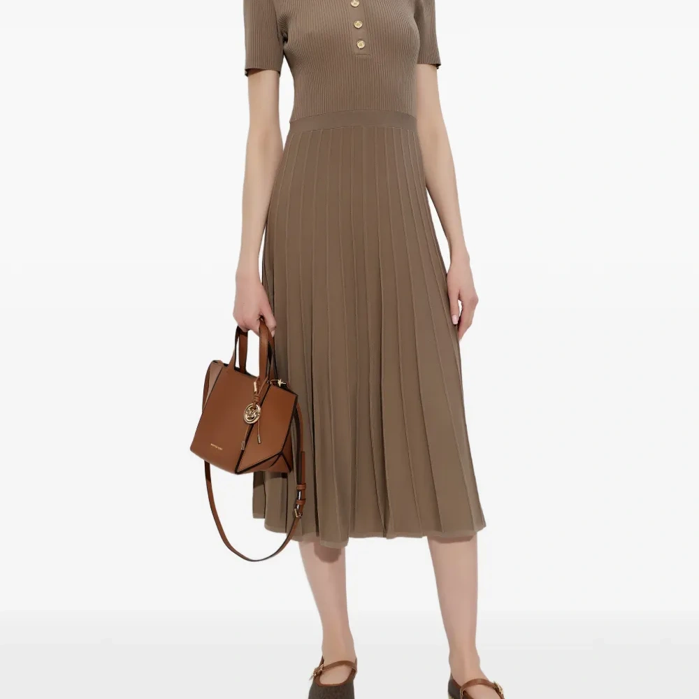каштаново-коричневое вязаное платье в рубчик с застежкой на пуговицы, воротником поло, короткими рукавами и плиссированной юбкой