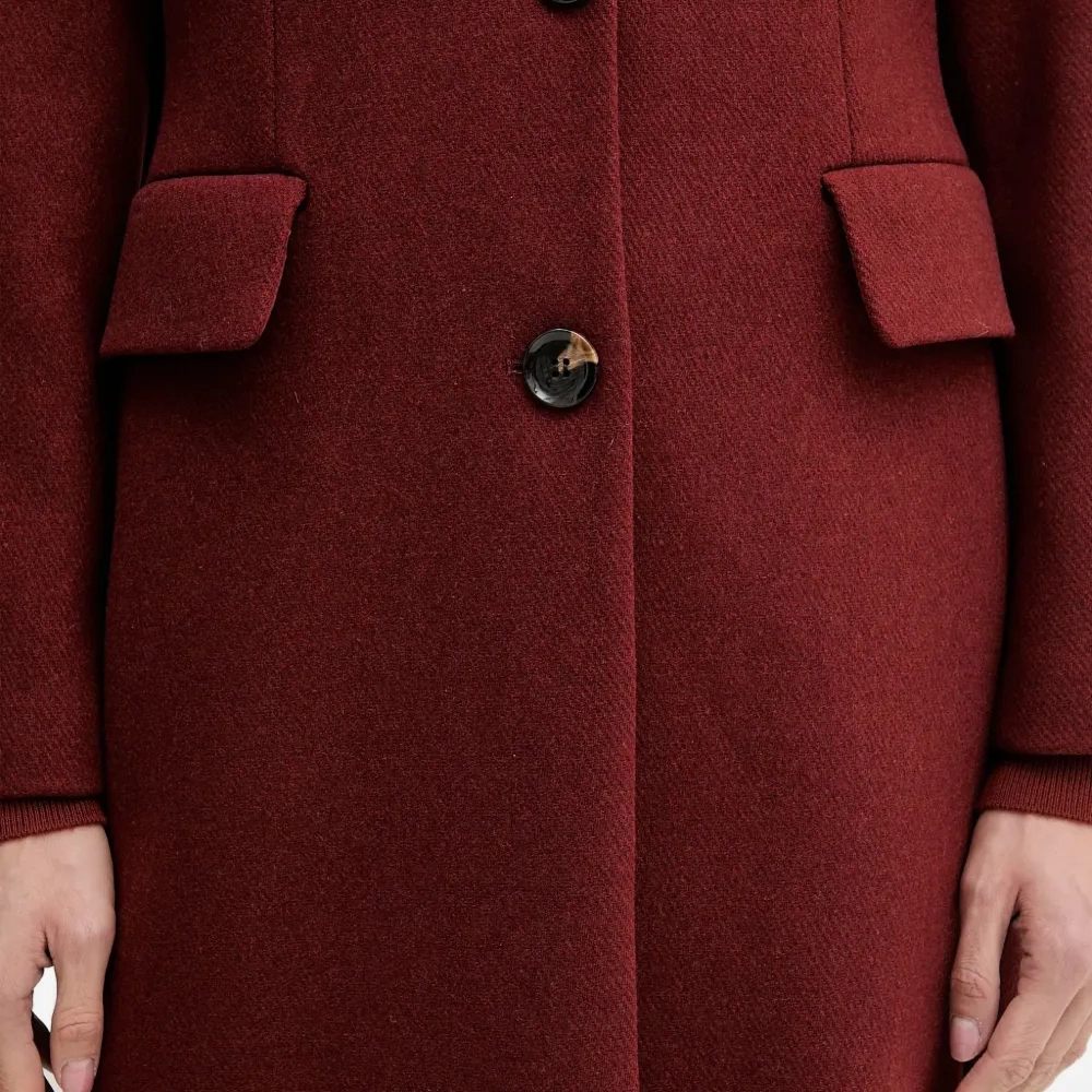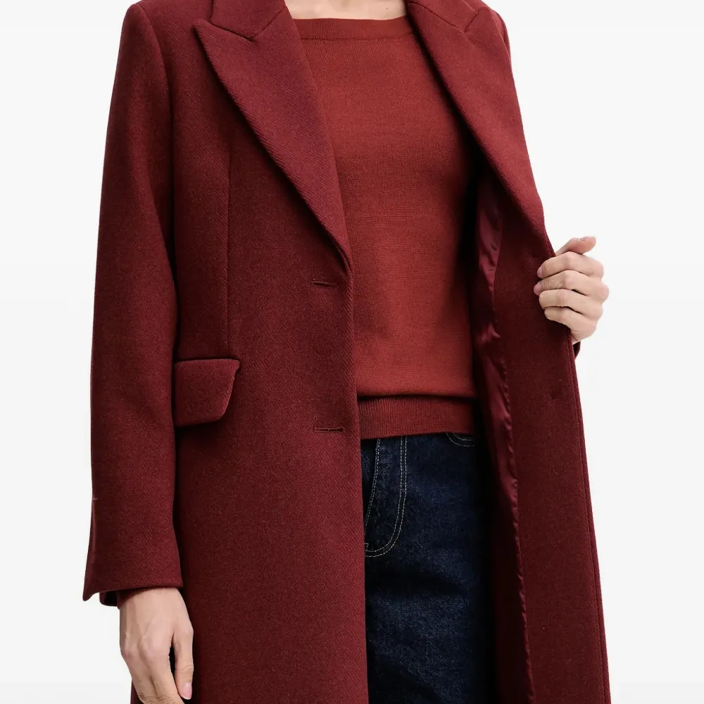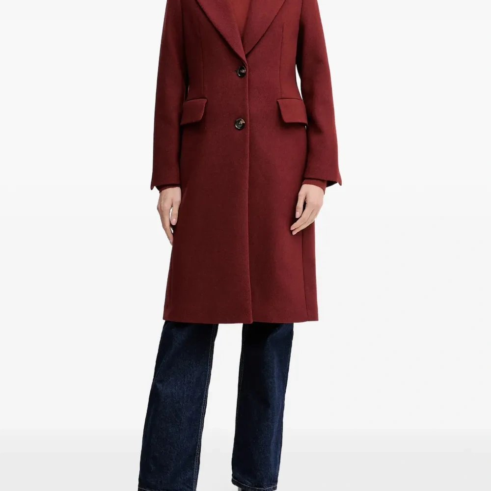 красные заострённые лацканы, карманы с клапанами, застёжка на две пуговицы, длинные рукава
