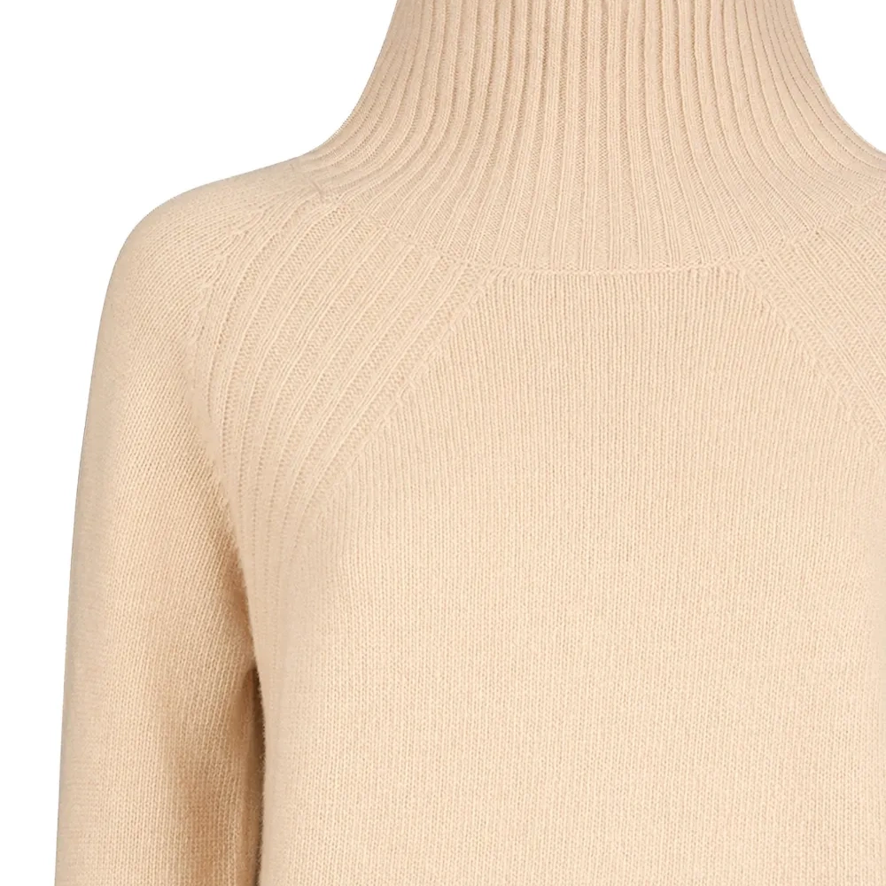 бежевый тонкий трикотаж с высоким воротом, длинными рукавами и рубчатой отделкой