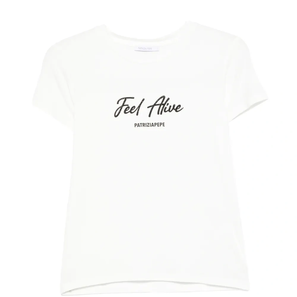 белая футболка с круглым вырезом, короткими рукавами и принтом-логотипом