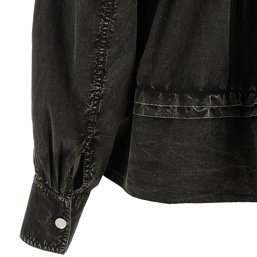 черные оборки спереди и сзади, длинные рукава, манжеты на пуговицах