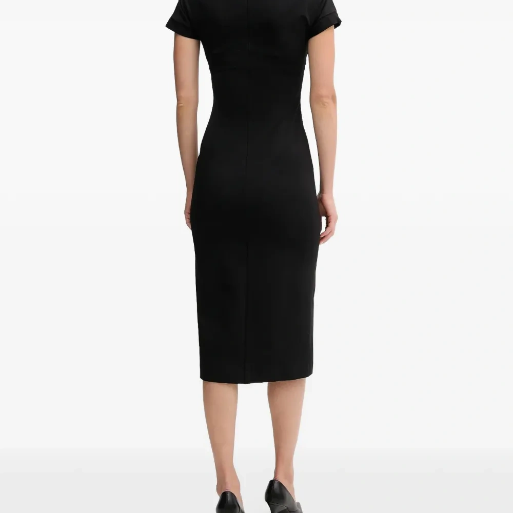 чёрное платье с круглым вырезом, короткими рукавами, кольцевым элементом, боковым разрезом и скрытой застёжкой-молнией