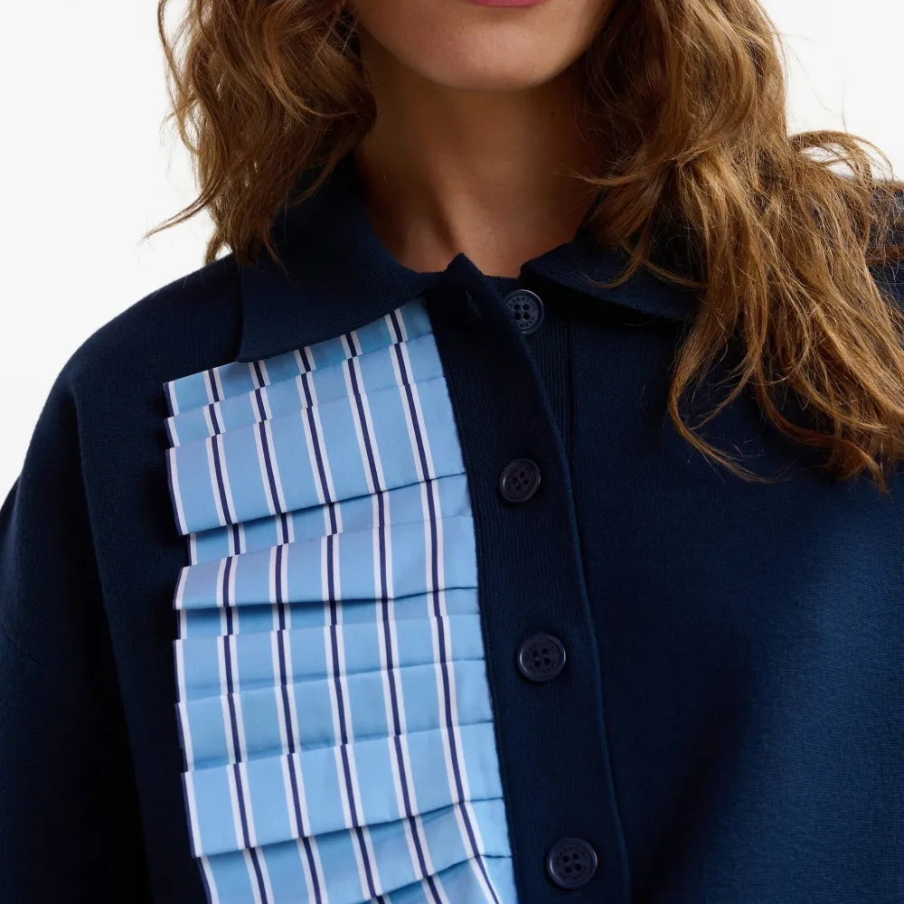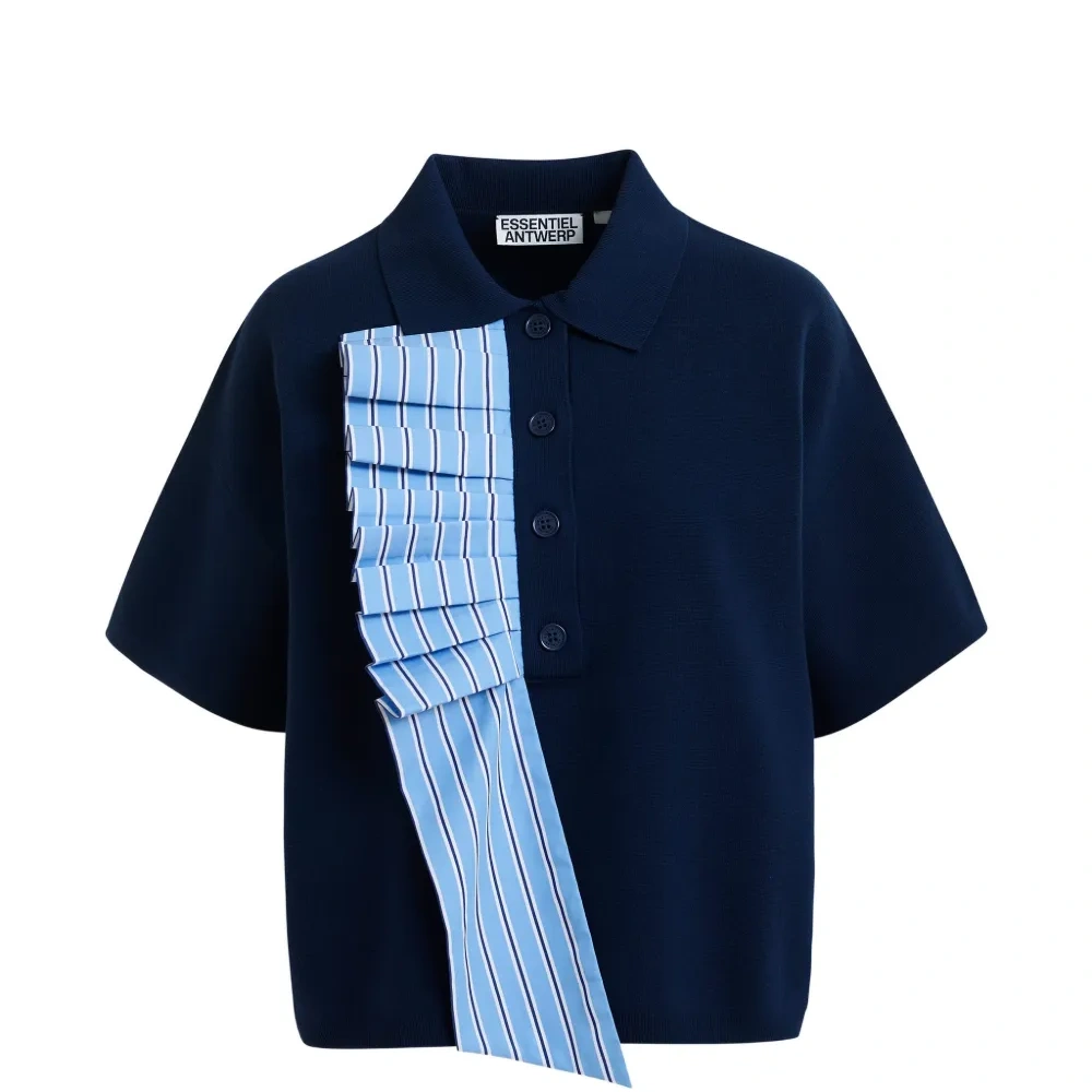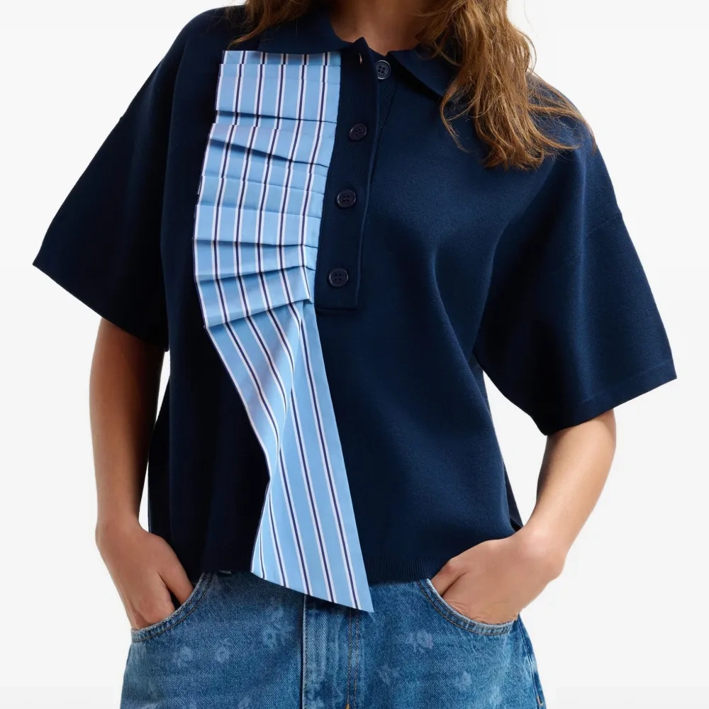 светло-голубой с полосатой отделкой, короткие рукава, однотонные пуговицы, воротник "поло"