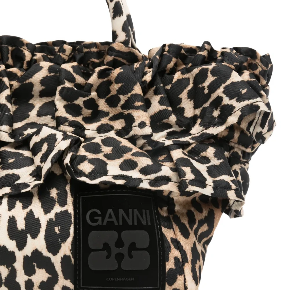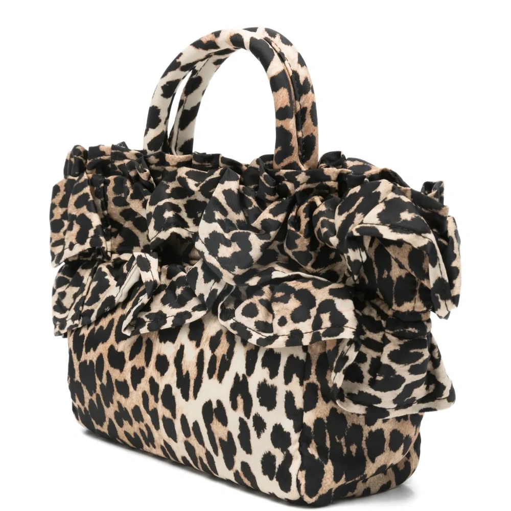 коричневая сумка с леопардовым принтом, верхними ручками, регулируемым и съемным наплечным ремнём, оборками