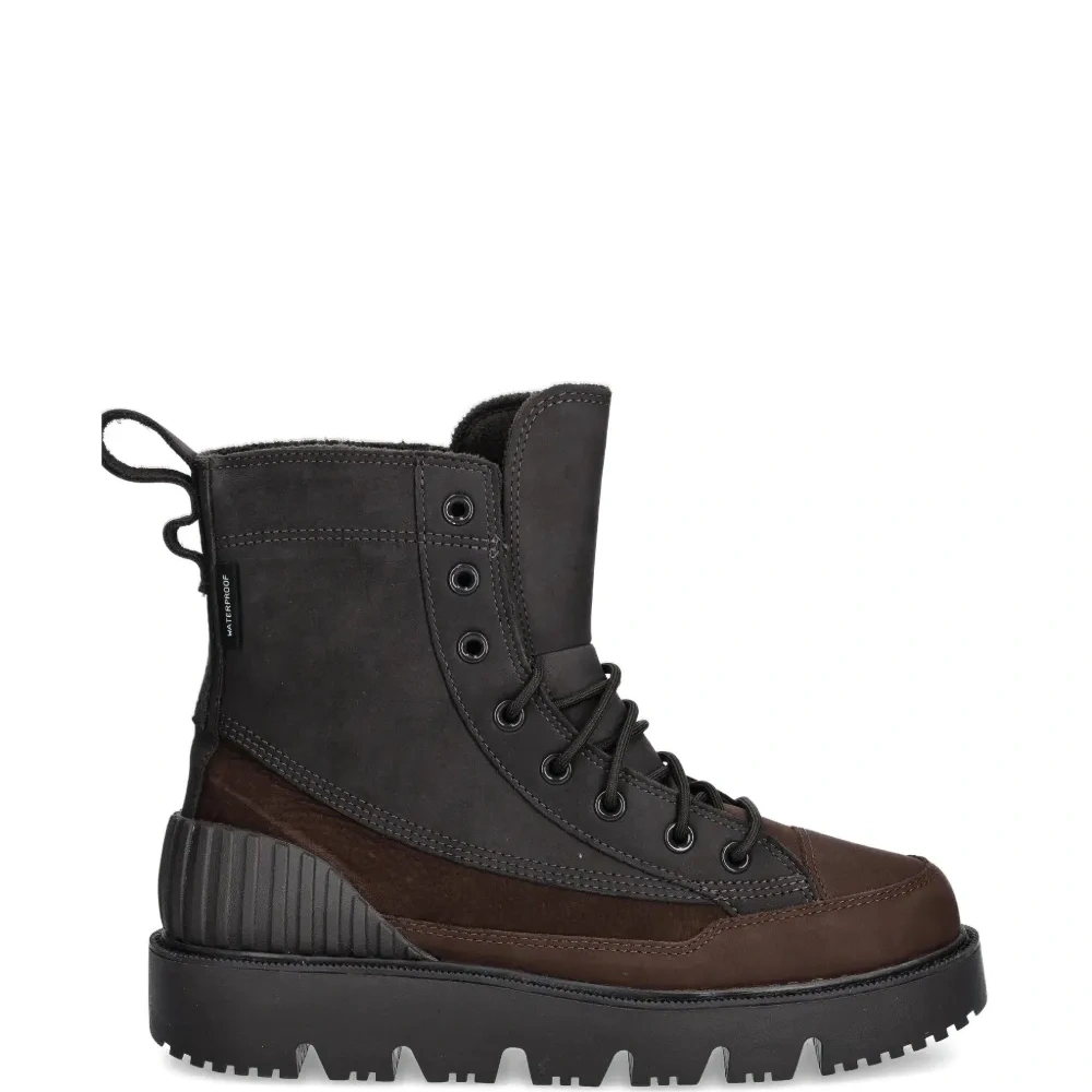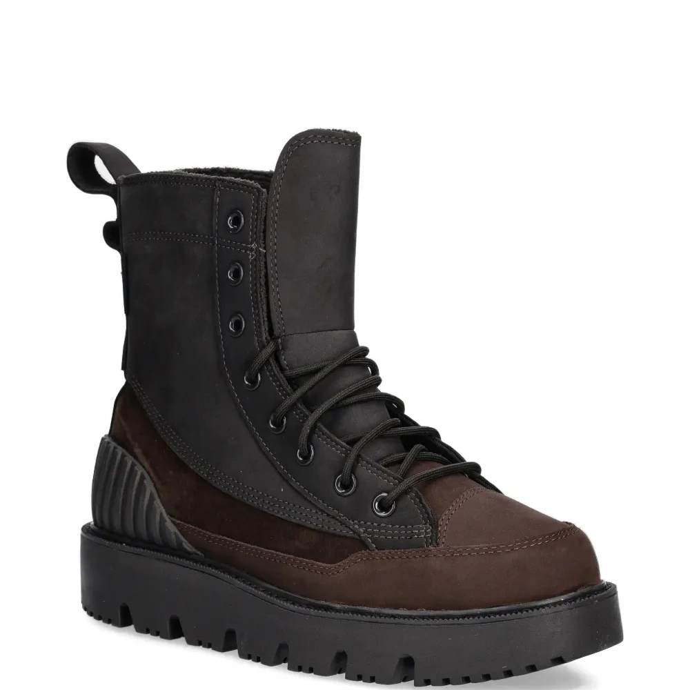черный и коричневый цвет, круглый носок, шнуровка, петля на пятке, рифленая подошва, отделка люверсами