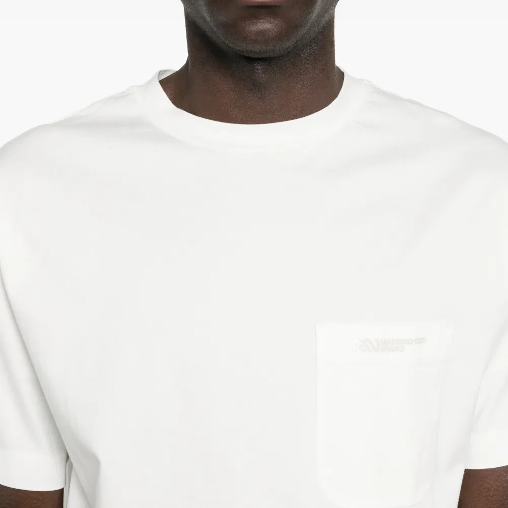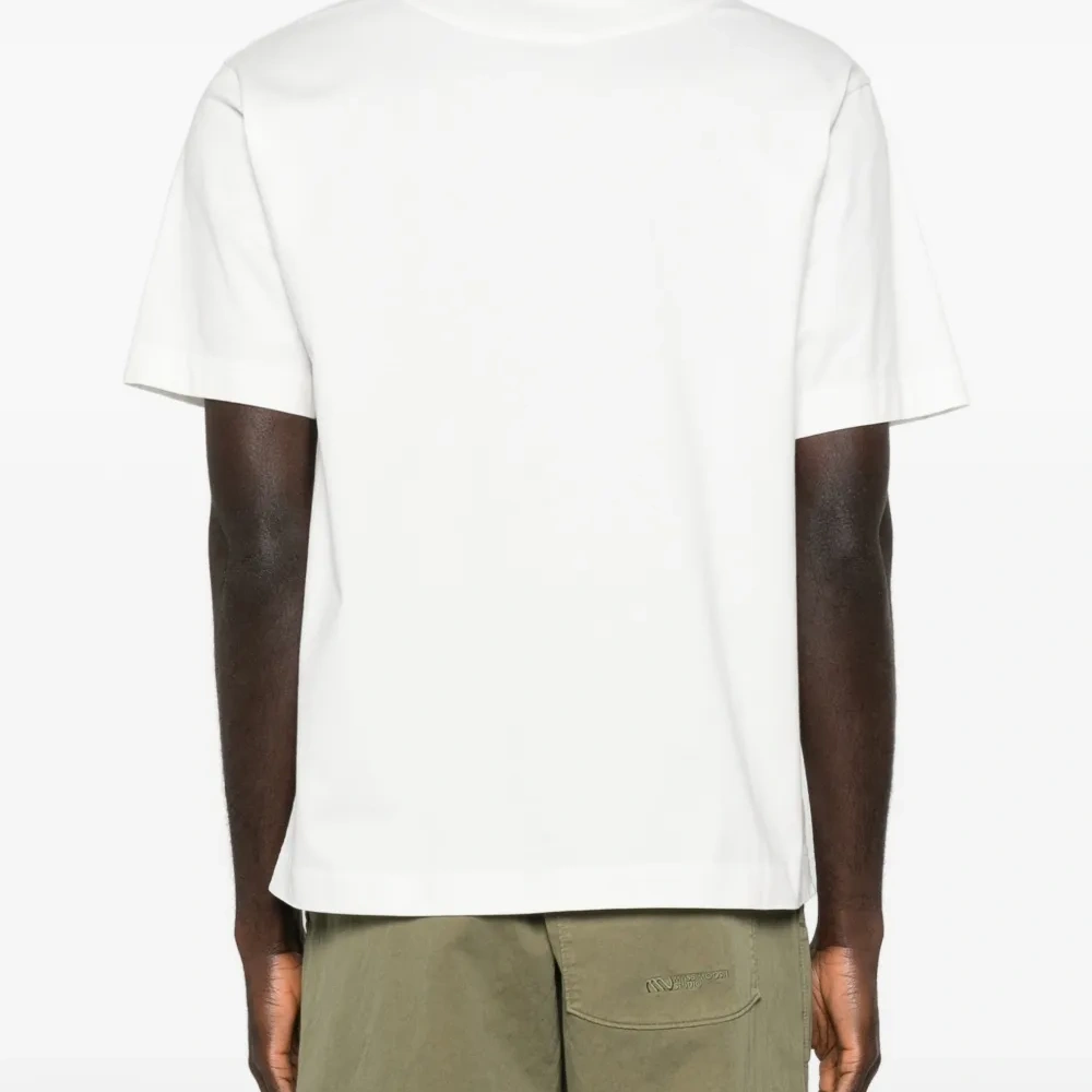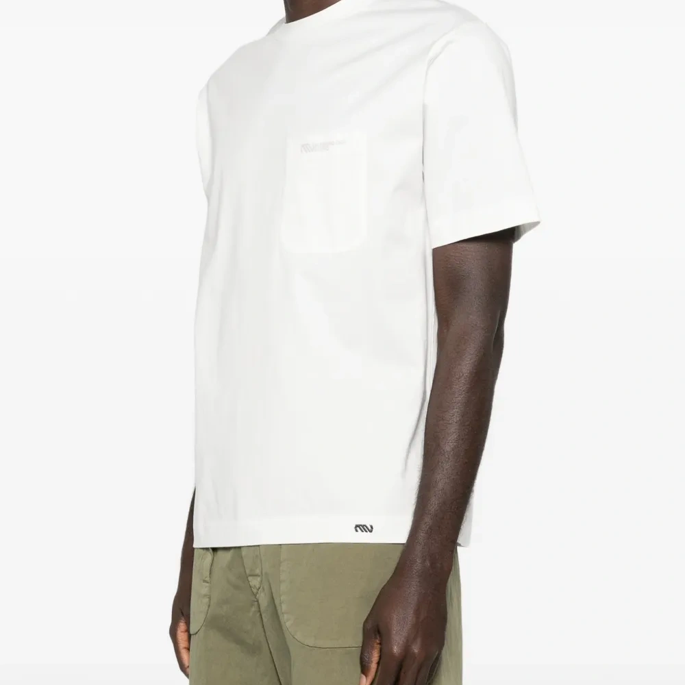 белая футболка с короткими рукавами, круглым вырезом и логотипом на нагрудном кармане