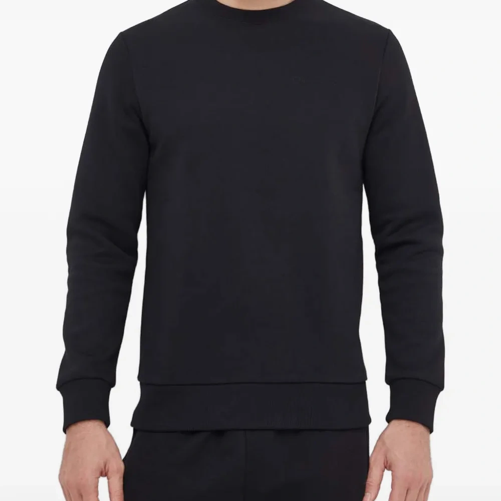 чёрный свитшот с тиснёными элементами, круглый вырез, длинные рукава, ребристый подол, ребристые манжеты