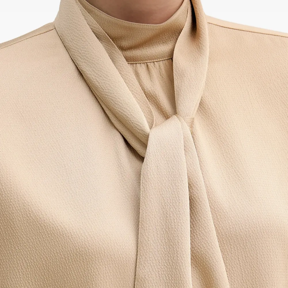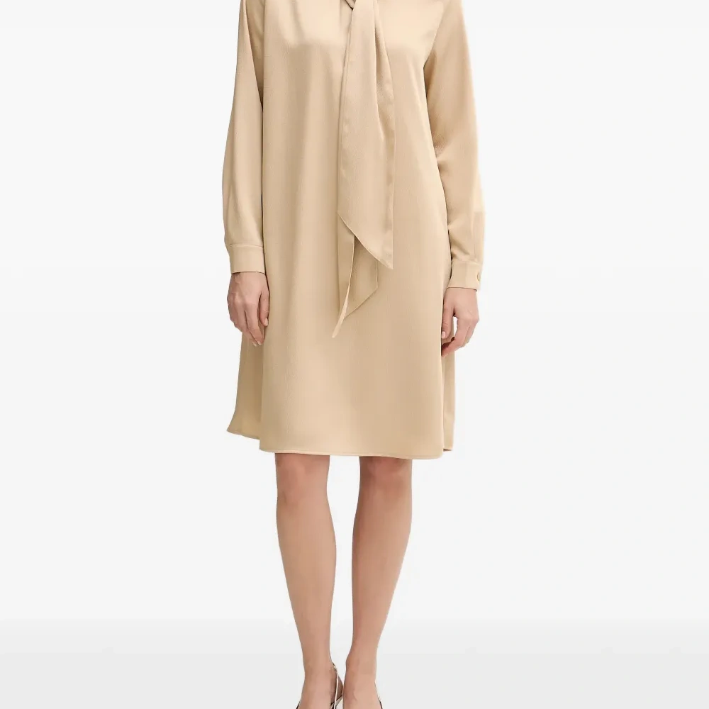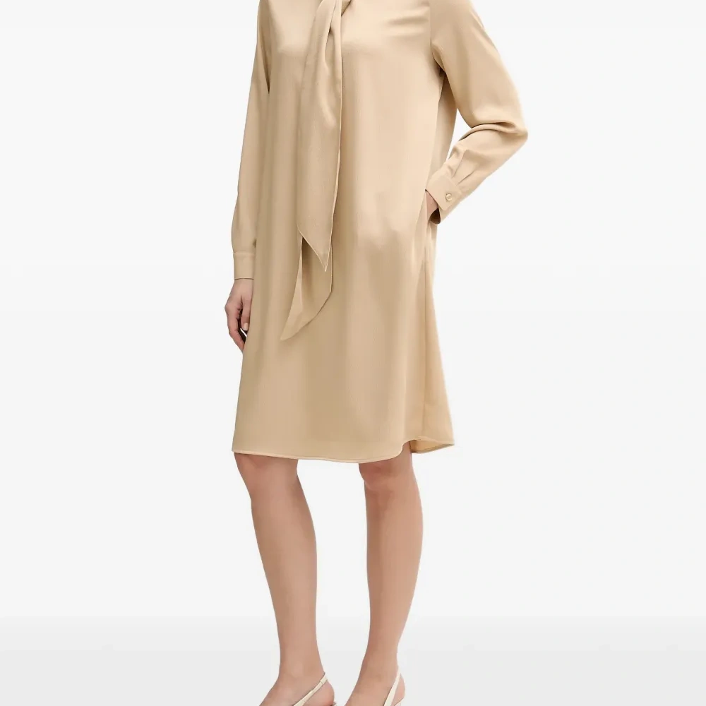жёлтое платье средней длины с завязками, длинными рукавами, боковыми карманами и манжетами на пуговицах