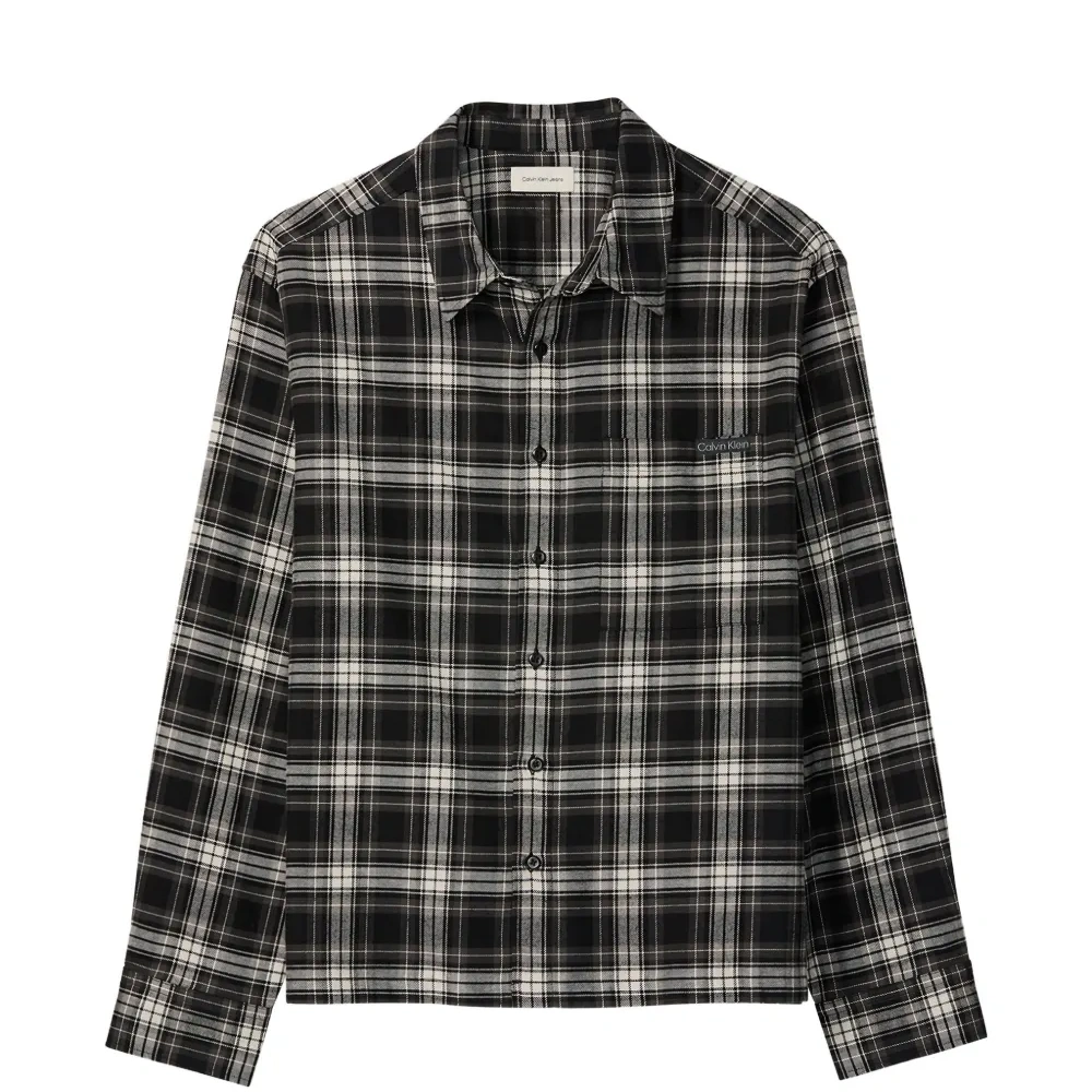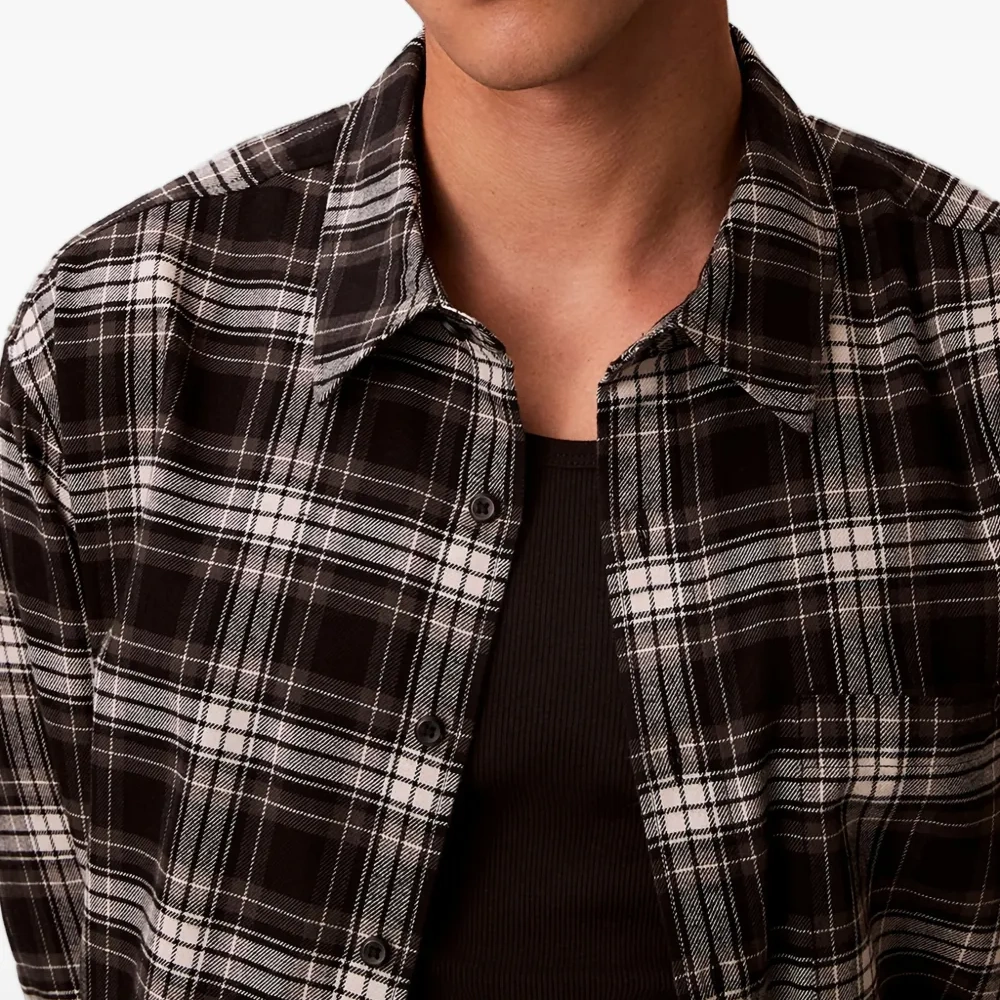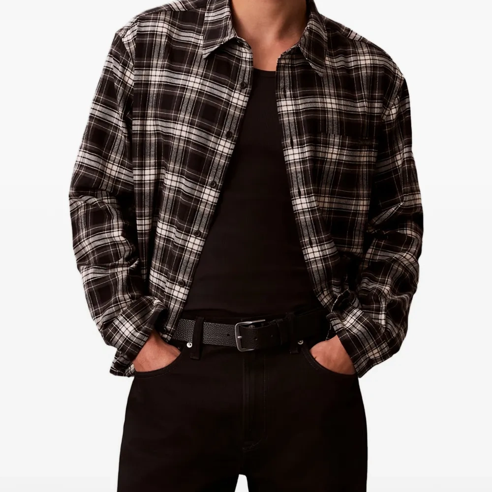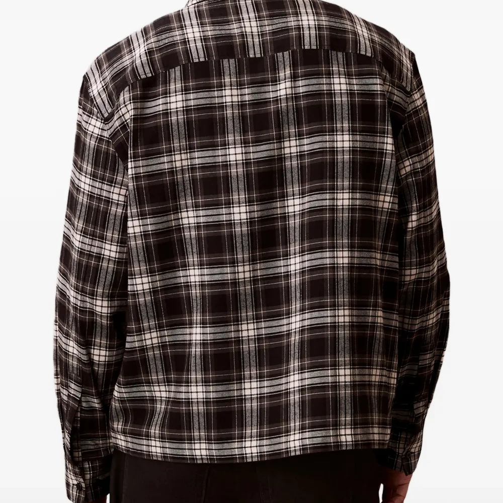 коричневая рубашка в клетку с длинными рукавами, застёжкой на пуговицы спереди, классическим воротником и нагрудным накладным карманом