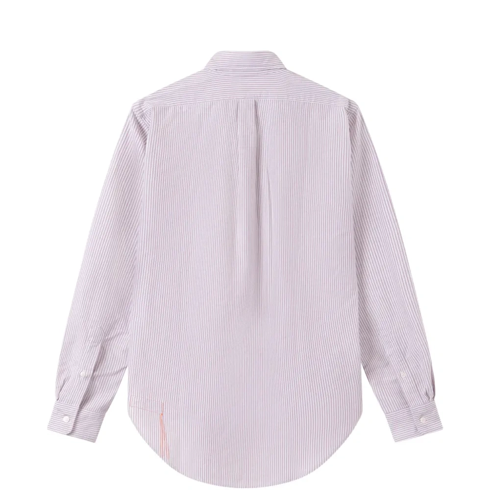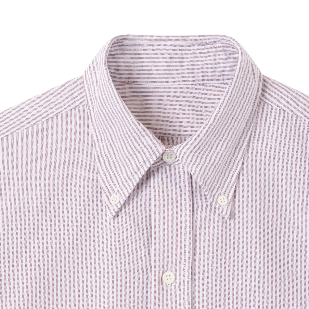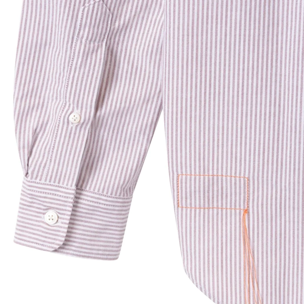 коричневая рубашка в полоску с воротником на пуговицах, нагрудным карманом, манжетами на пуговицах и отделкой оранжевой строчкой