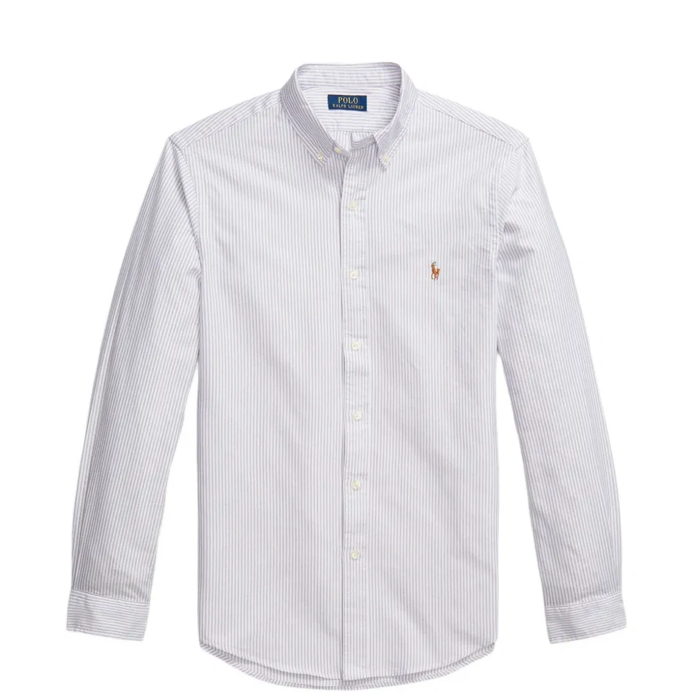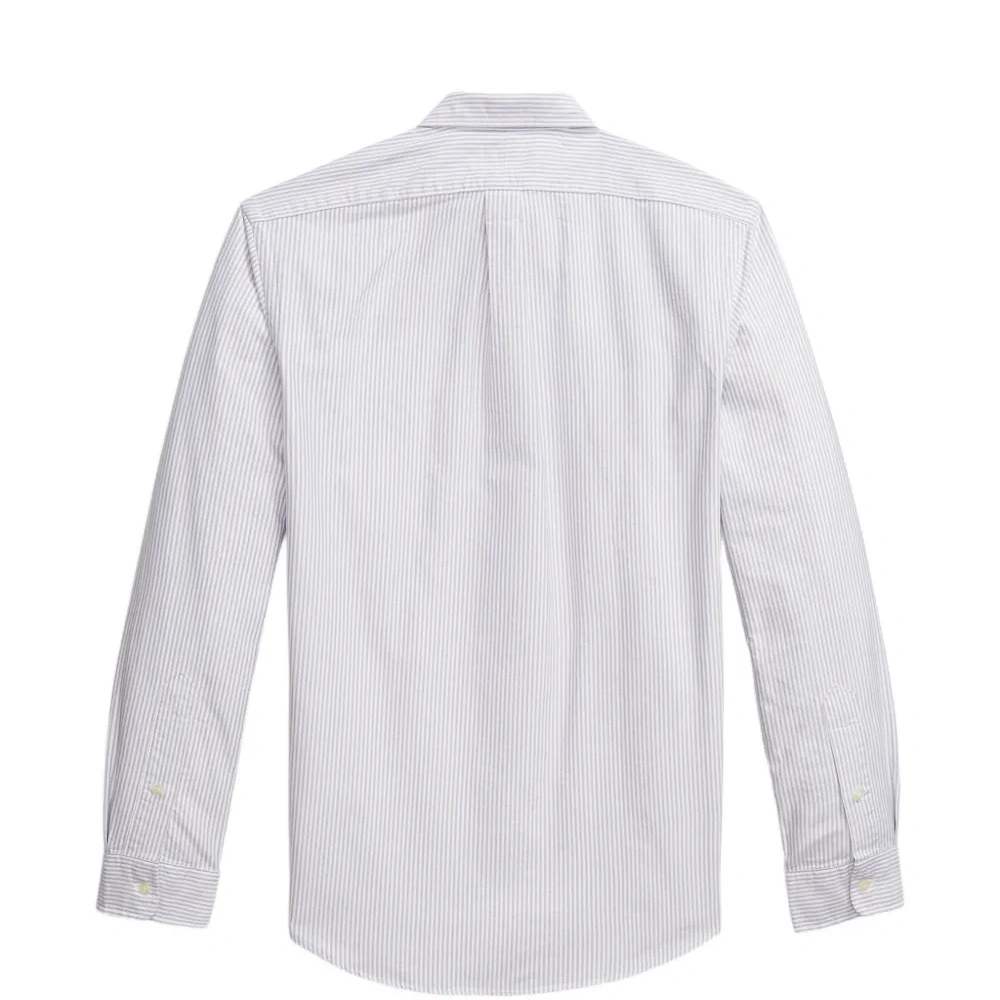 фиолетово-белая рубашка в полоску с длинными рукавами, застежкой на пуговицы, вышитым логотипом и манжетами на пуговицах