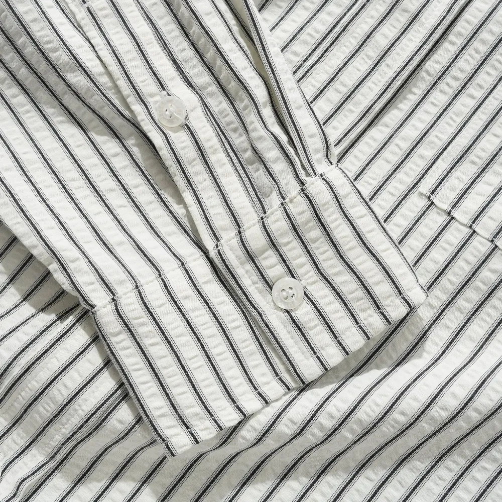 белая рубашка с полосатым принтом, вышивкой на груди, отложным воротником, длинными рукавами и застежкой на пуговицы
