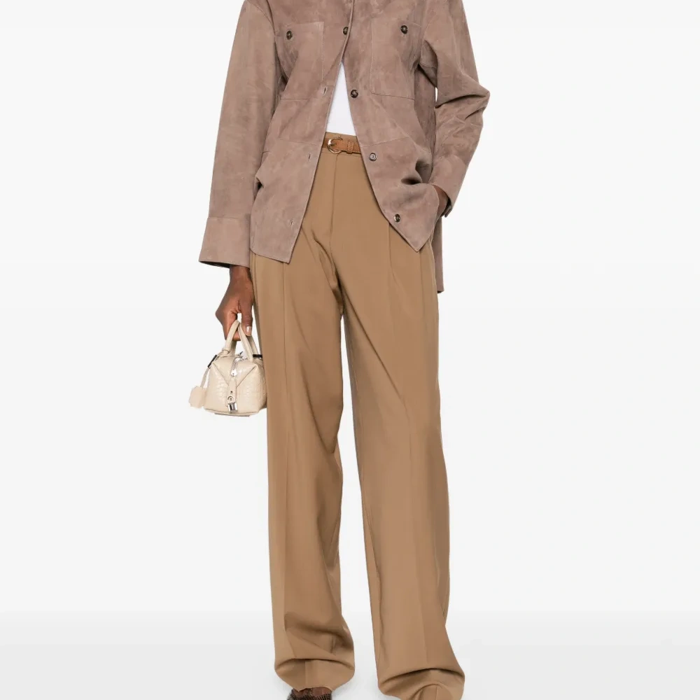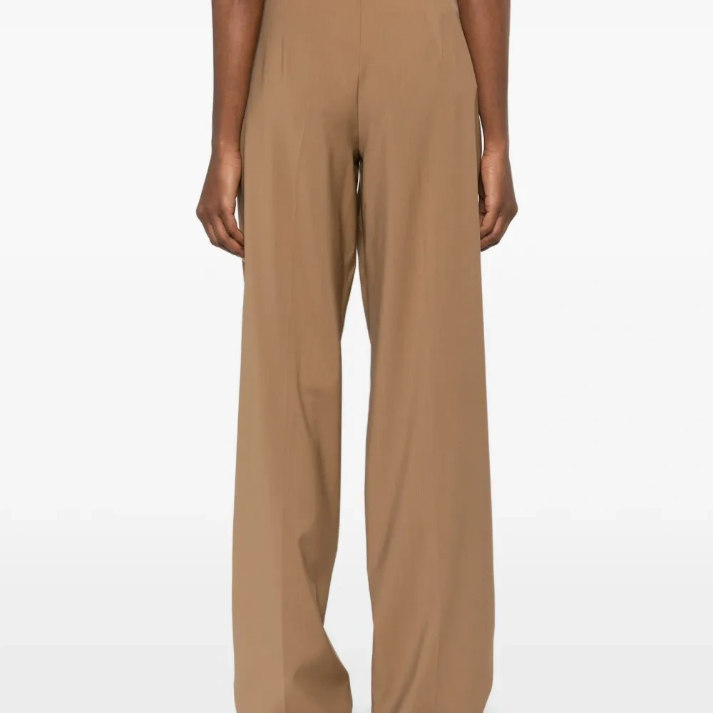 коричневый цвет, пояс на талии, передние складки, боковые карманы в швах, застежка на молнии с потайной планкой, шлевки для ремня