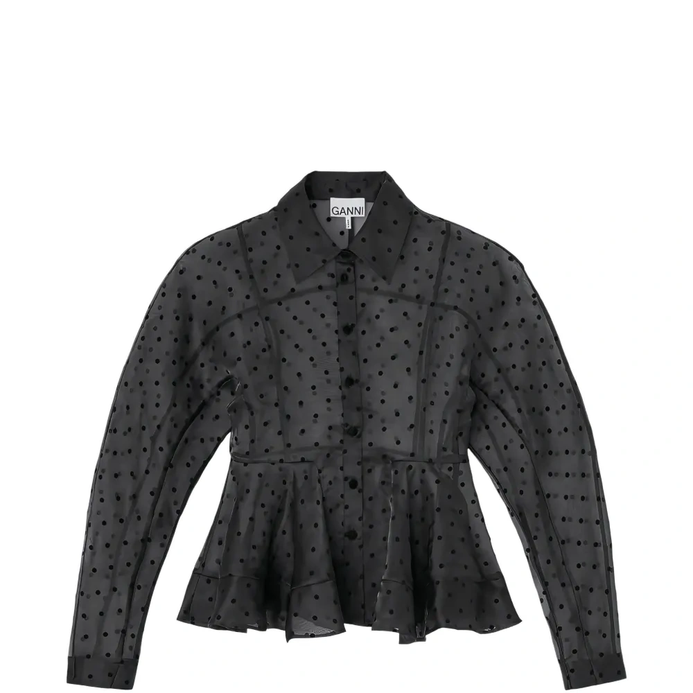 черная блузка в горошек с баской, оборчатым подолом, классическим воротником, длинными рукавами и застежкой на пуговицы