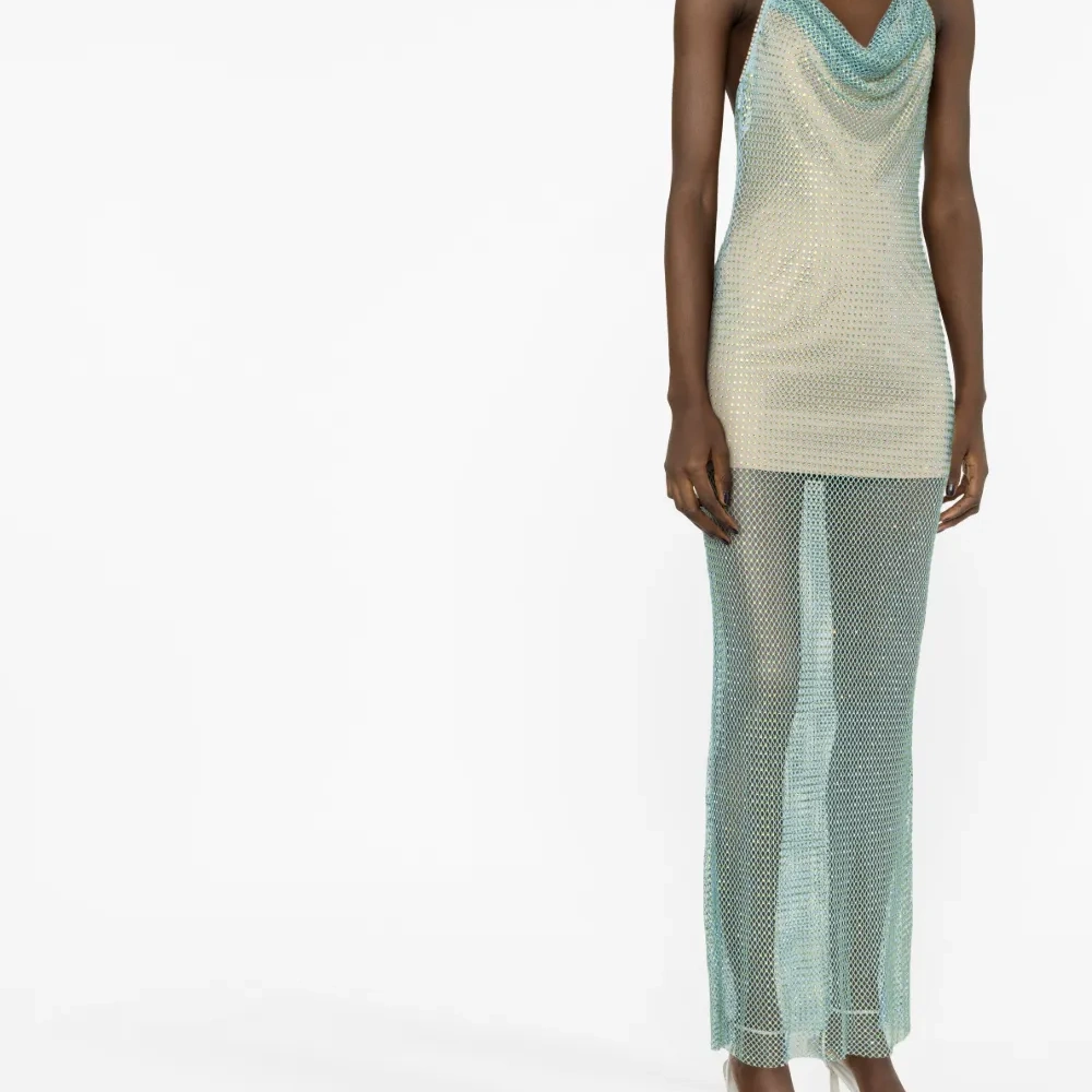 Мятно-зеленый, сетка, украшения из горного хрусталя, вырез-петля халтер, воротник-хомут и высота по щиколотку.