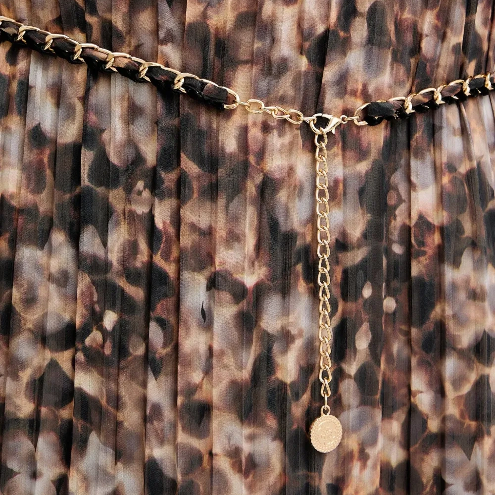 коричневое/разноцветное платье с круглым вырезом, длинными рукавами, поясом-цепочкой и оборчатым подолом