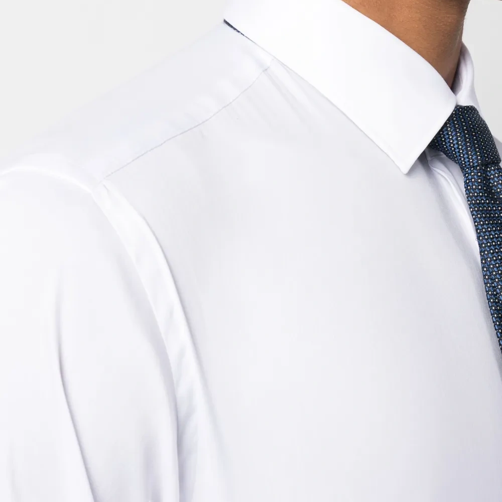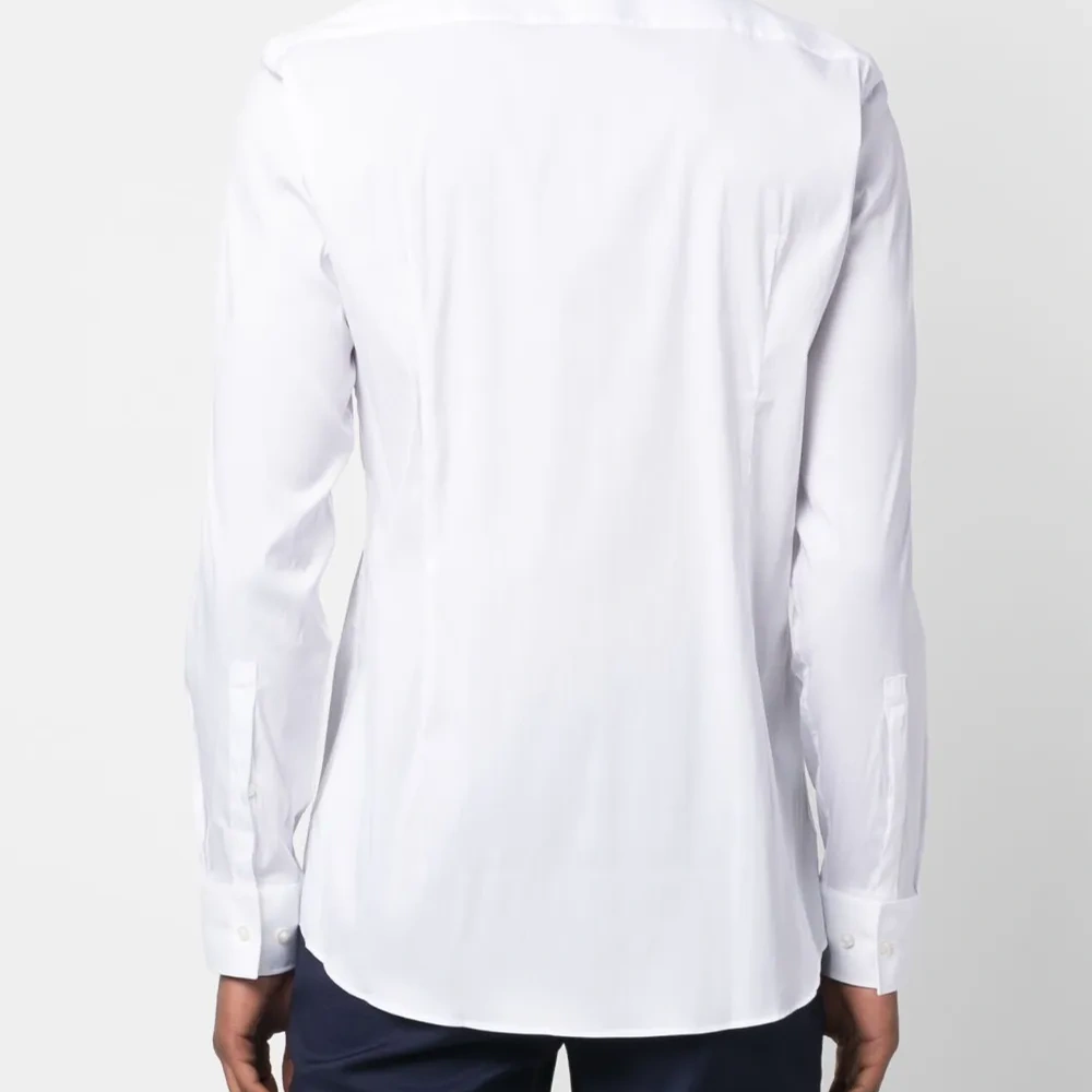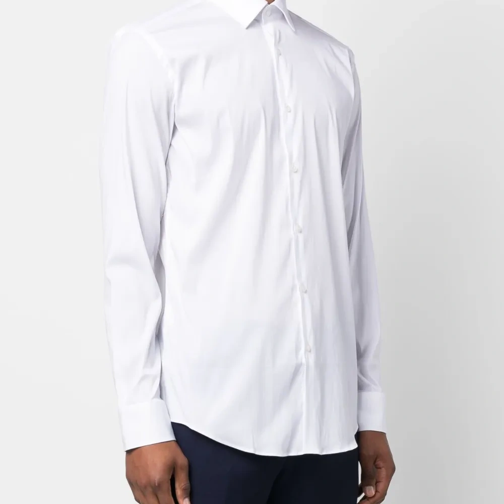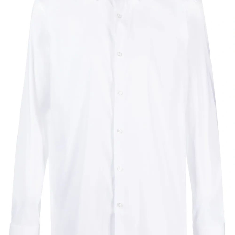 Белый, хлопок, классический воротник, застежка на пуговицах спереди, длинные рукава, манжеты на пуговицах и закругленный подол.