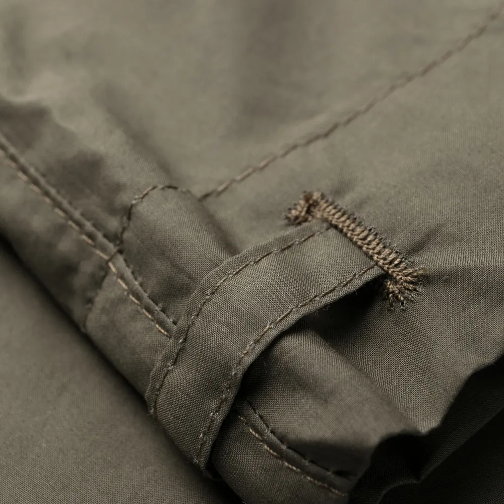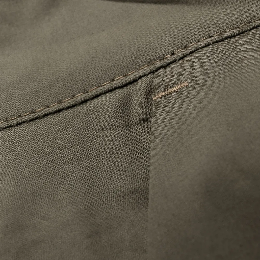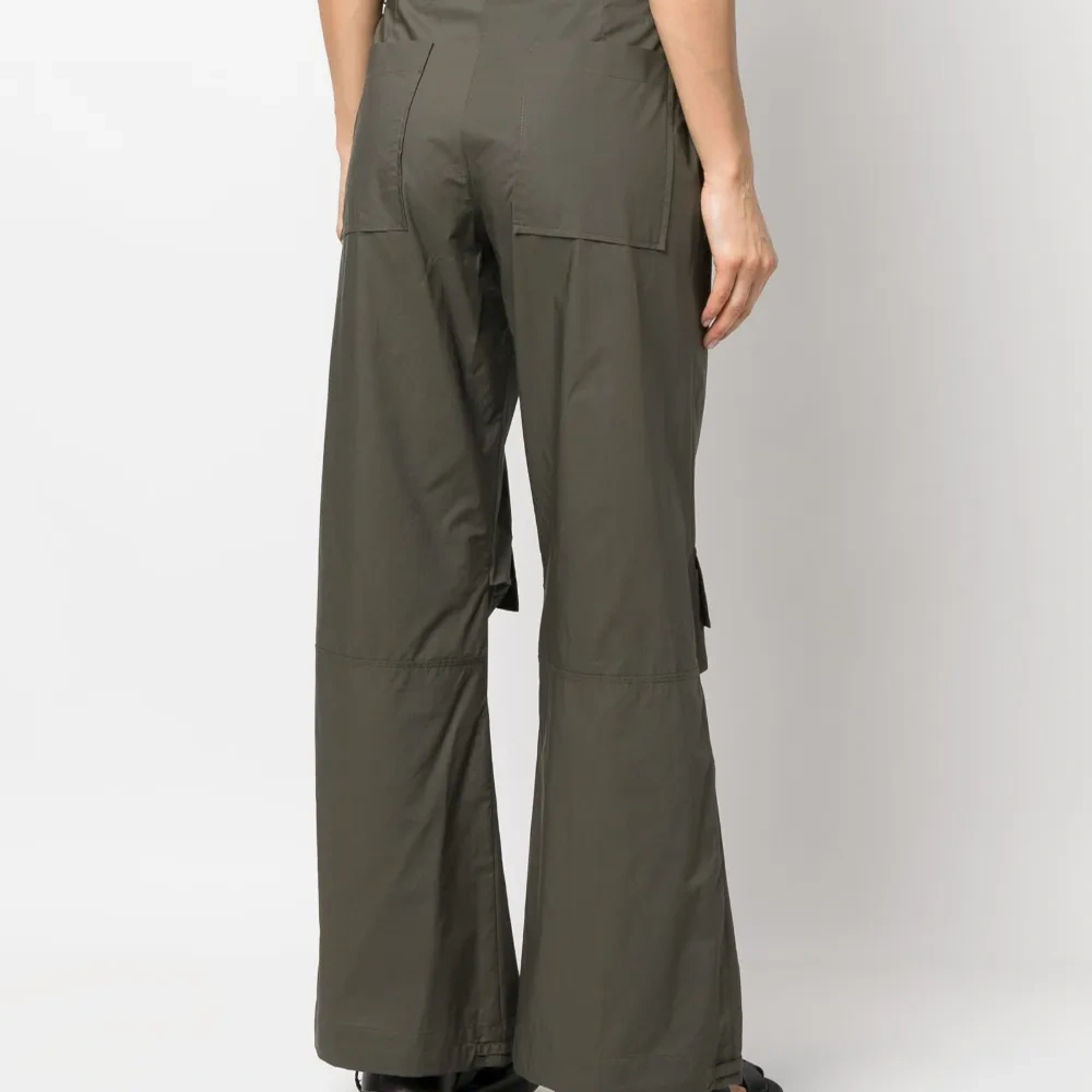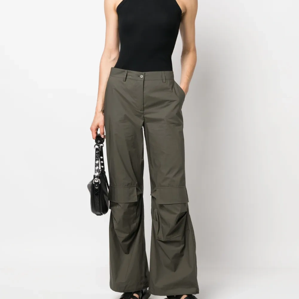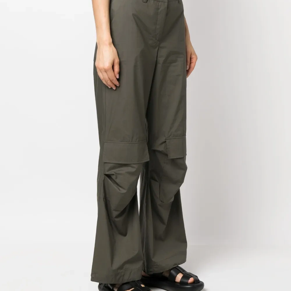 Оливково-зеленый, хлопок, широкий крой, петли для ремня, потайная застежка на молнии и пуговицах, два кармана карго спереди, два вшитых кармана по бокам и два накладных кармана сзади.