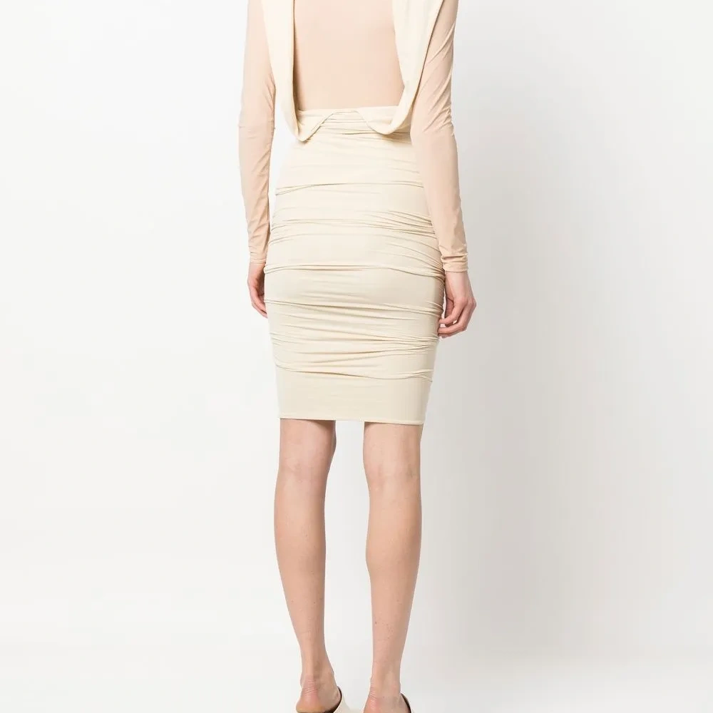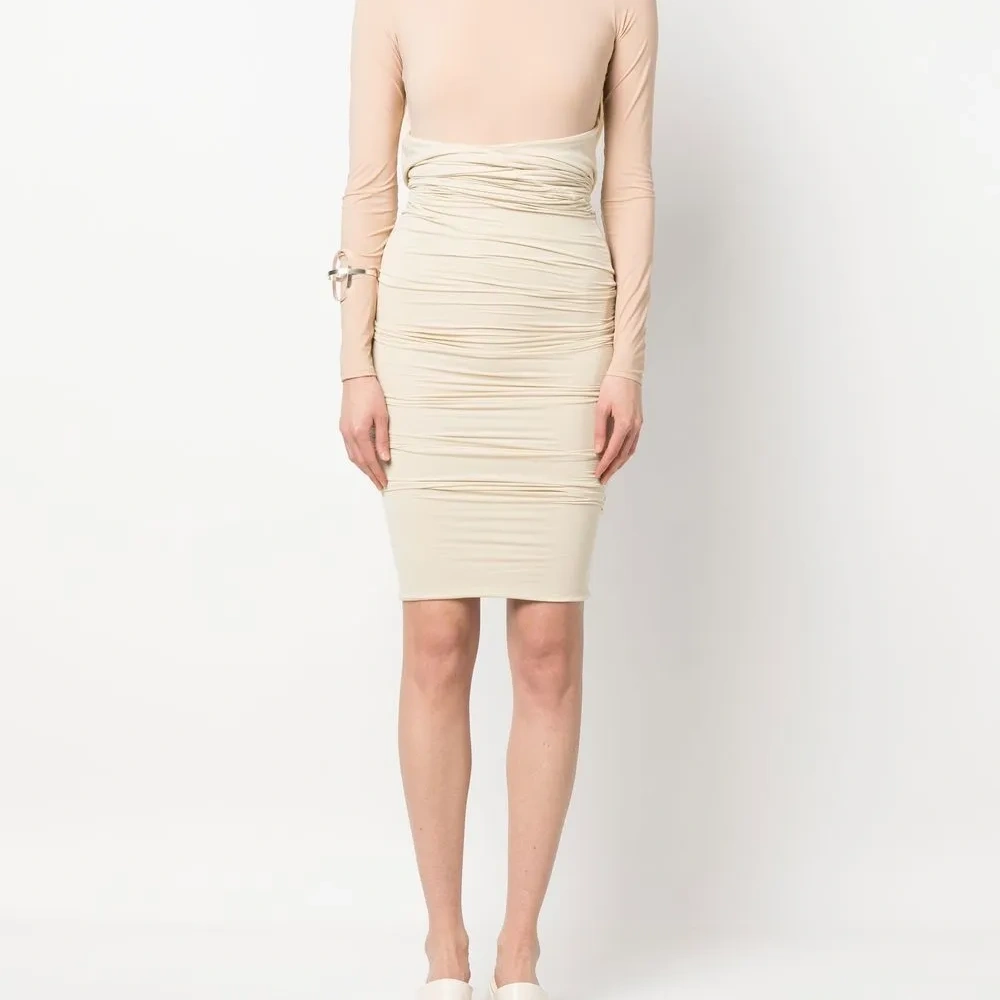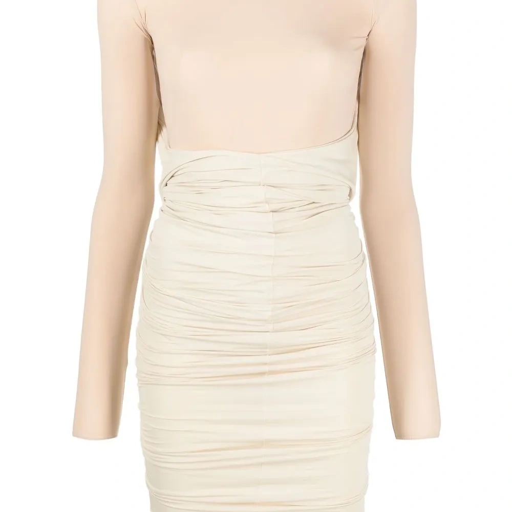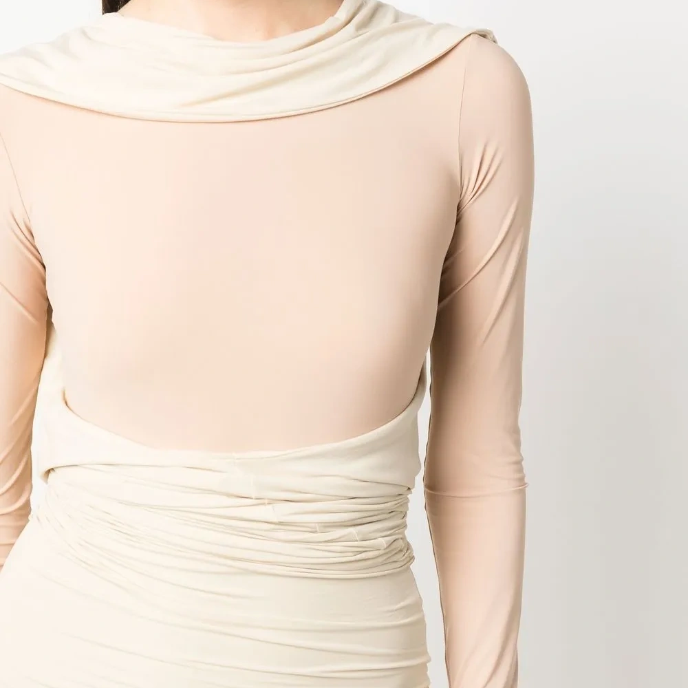 Светло-бежевый, однотонная расцветка, детали с оборками, многослойный эффект, воротник со сборками, длинные рукава и длина выше колена.