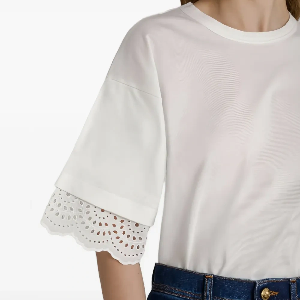 белая блузка с отделкой в технике англез, круглым вырезом и короткими рукавами