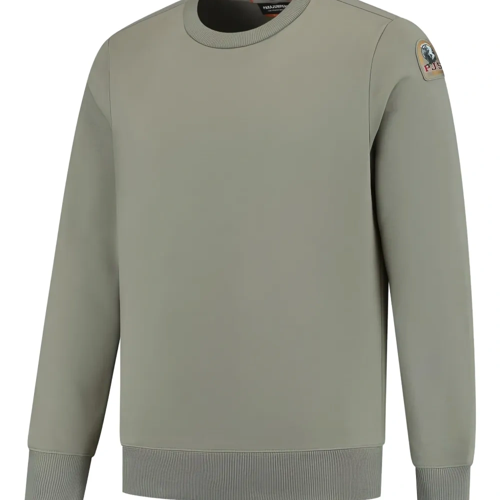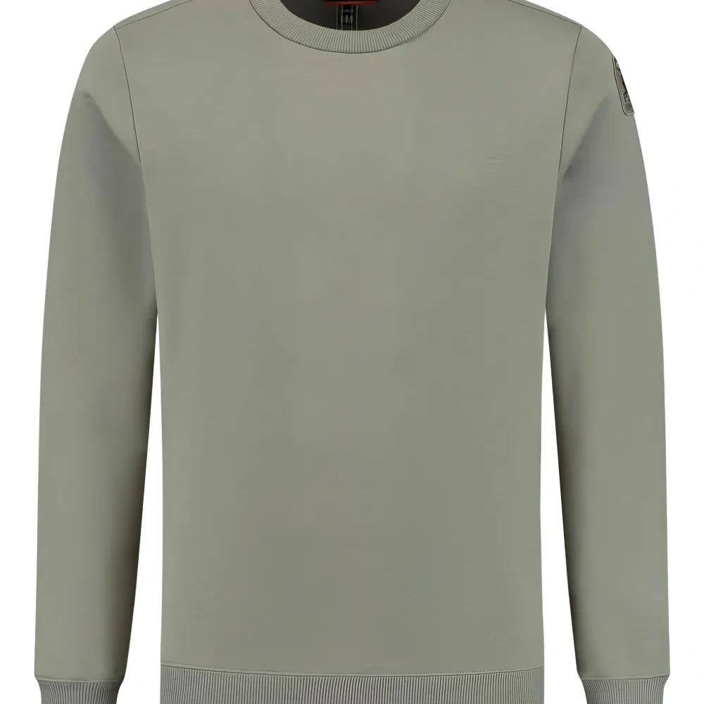 светло-оливковый свитер с круглым вырезом, ребристыми манжетами, нашивкой и длинными рукавами