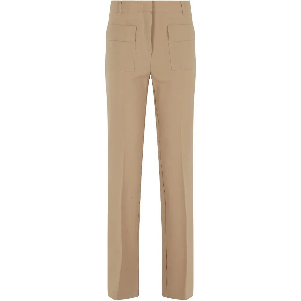 бежевые прямые брюки, шлевки для ремня, задний прорезной карман, боковые карманы с клапанами, скрытая застежка