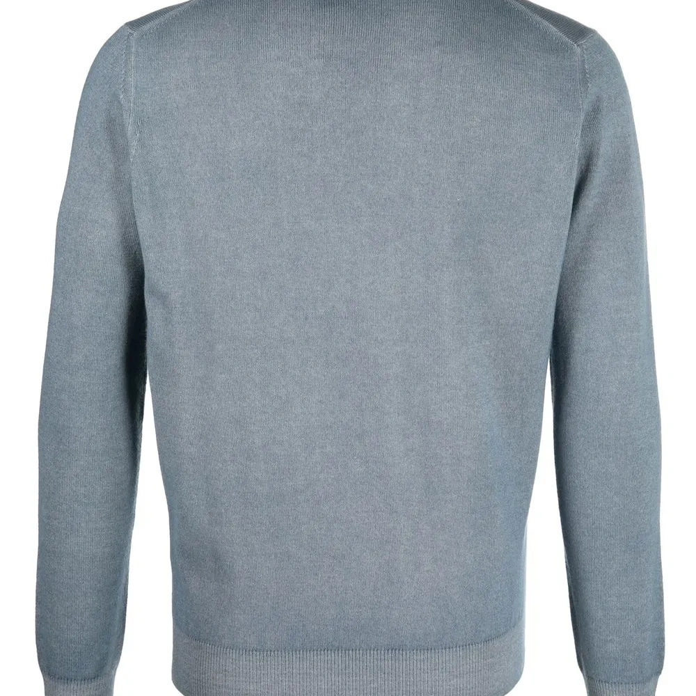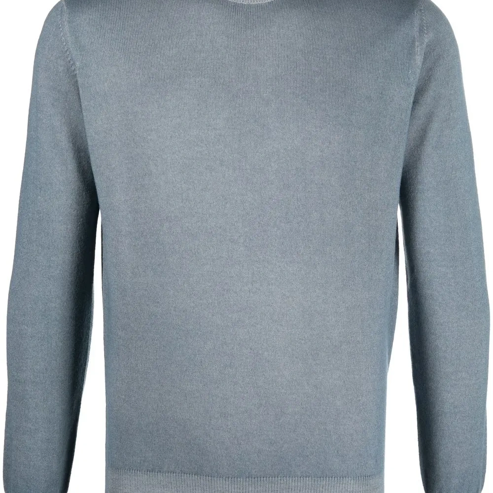 Голубой, смесовая шерсть мериноса, смесь кашемира и шелка, круглый вырез, длинные рукава и вязаные края в рубчик.