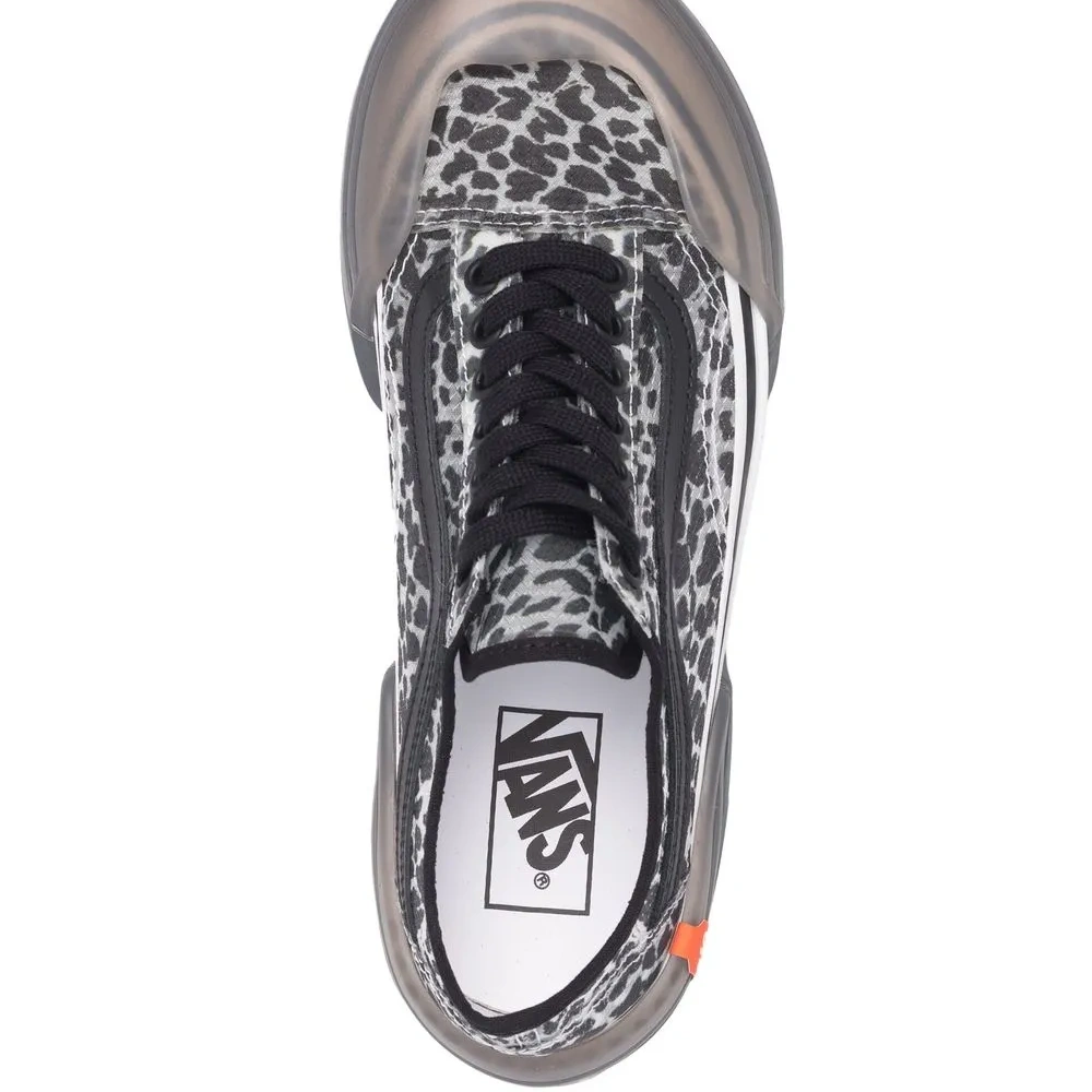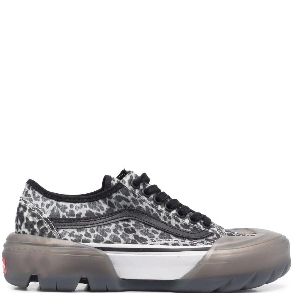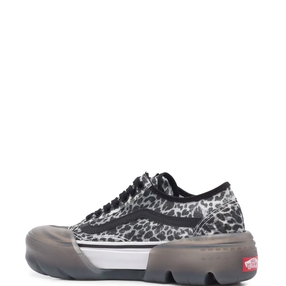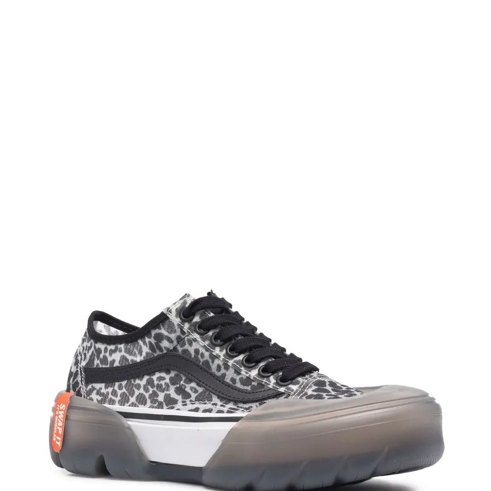 Угольно-серый, сплошной леопардовый принт, вставки, закругленный носок, шнуровка спереди и массивная резиновая подошва.