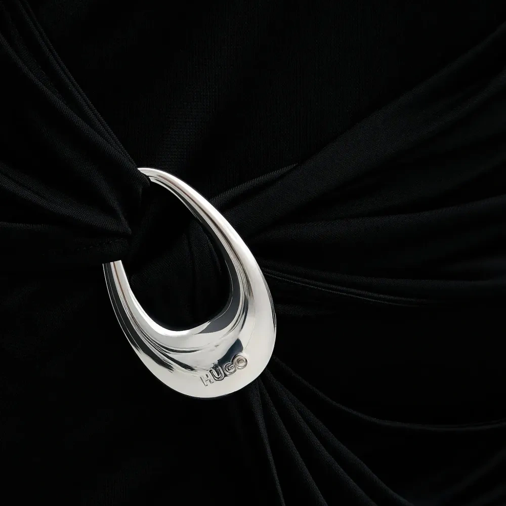 черное платье без рукавов с круглым вырезом, собранными деталями и кольцом