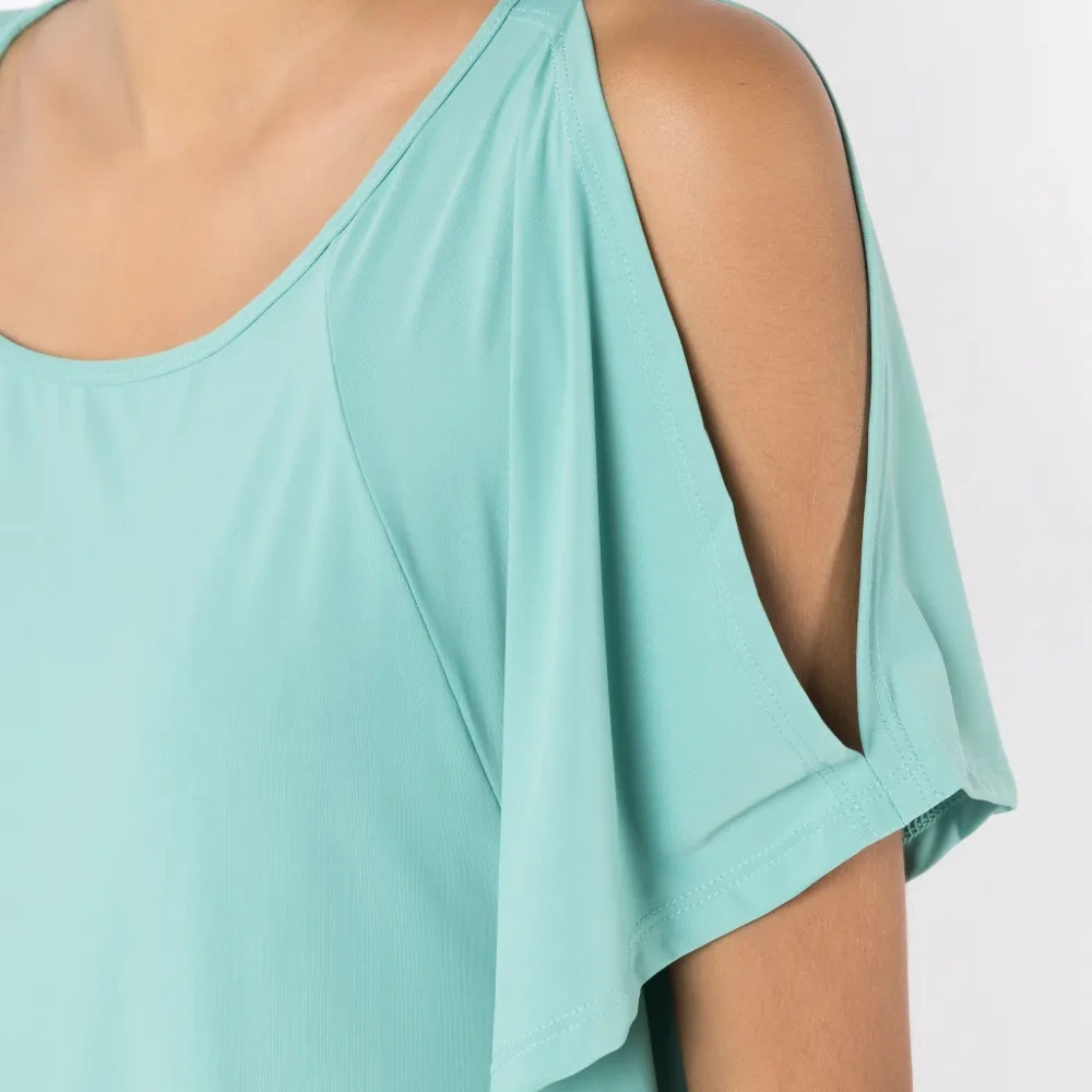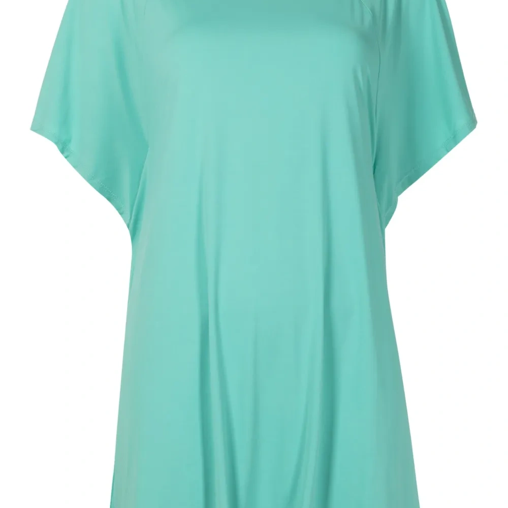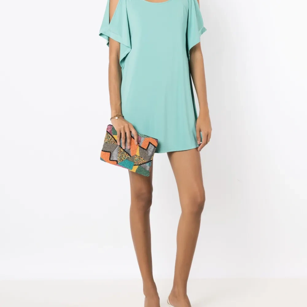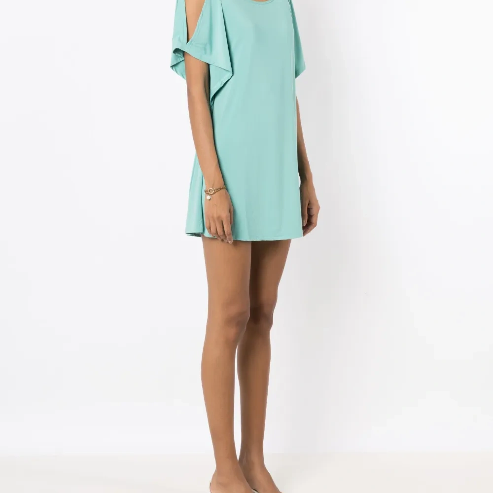 Сине-зеленый, эластичный материал, вырезные детали, U-образный вырез, короткие рукава, расклешенный подол и длина до бедер.