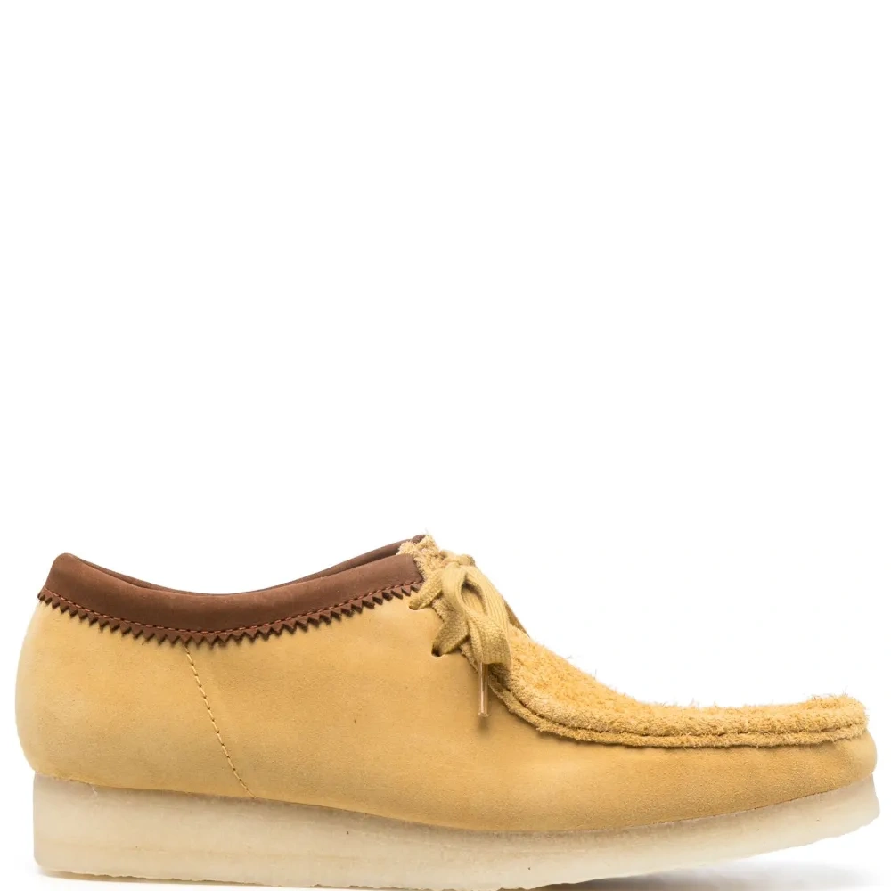 Янтарно-желтый, замша из телячьей кожи, стиль колор-блок, миндалевидный носок, шнуровка спереди, стелька с логотипом и резиновая подошва.