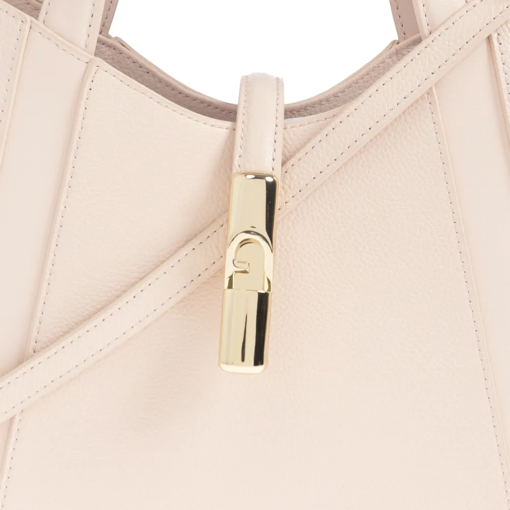 светло-розовый цвет, фурнитура под золото, верхние ручки, съемный ремень, застежка-пряжка, зернистая текстура