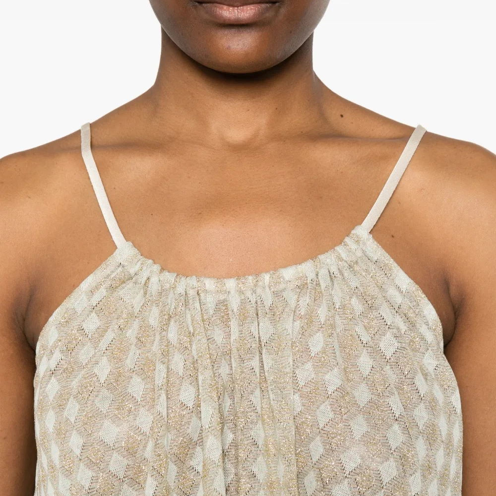 светло-бежевый цвет, тонкие бретели, геометрический узор, присборенная отделка