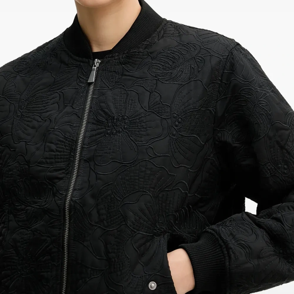 черный с цветочным узором, застежка-молния, круглый вырез, отделка в рубчик, прорезные карманы