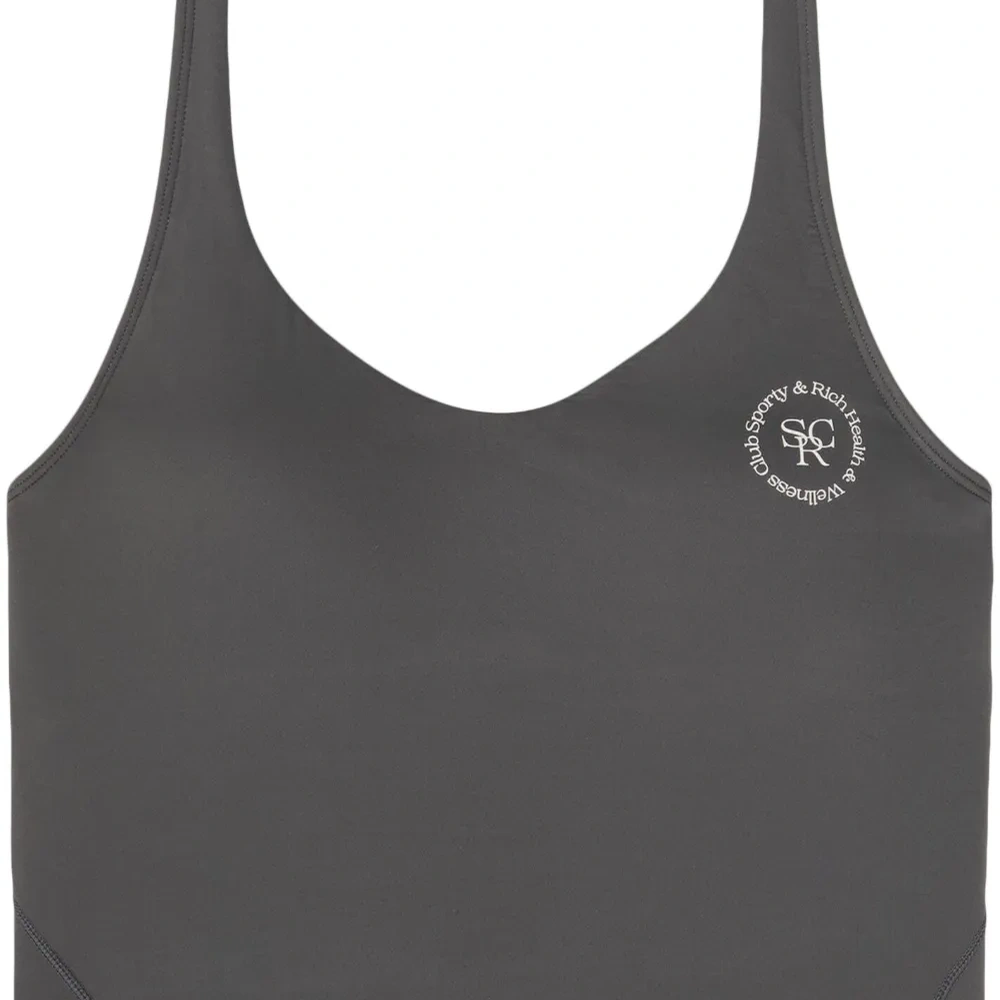Темно-серый, эластичный материал, принт с логотипом на груди, круглый вырез, без рукавов, прямой подол и укороченная длина.