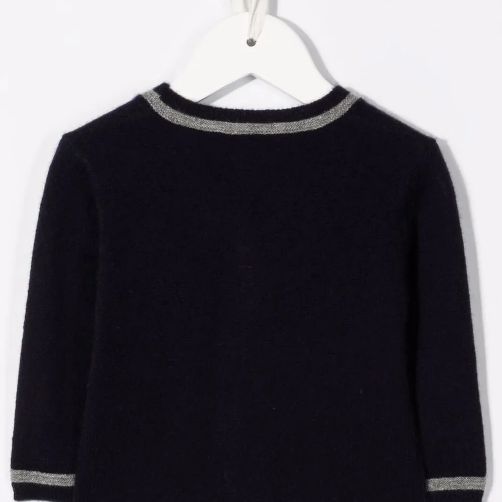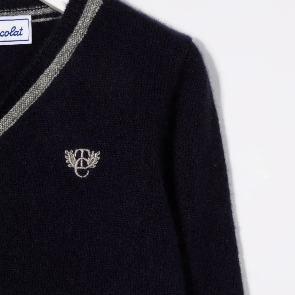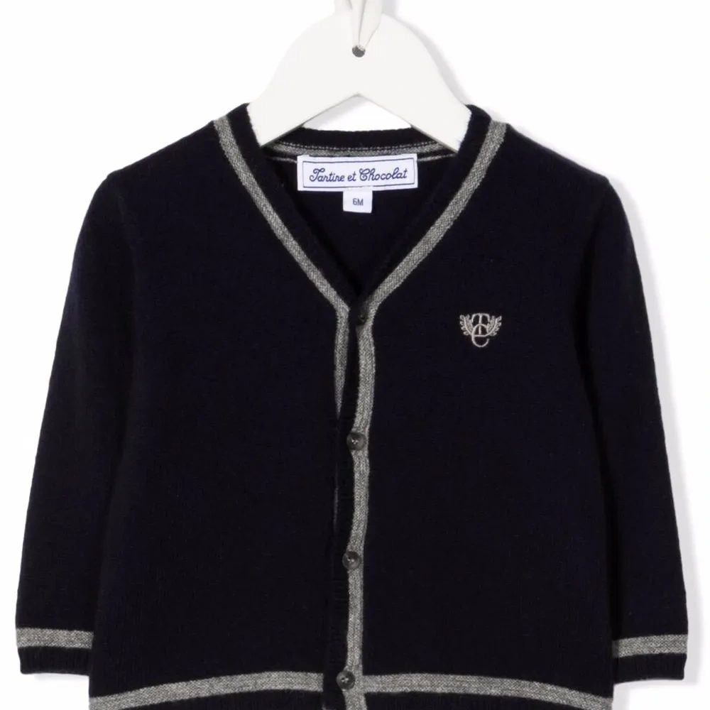 Вышитый логотип на груди, V-образный вырез, застежка на пуговицах спереди, длинные рукава, прямой подол и отделка в полоску.
