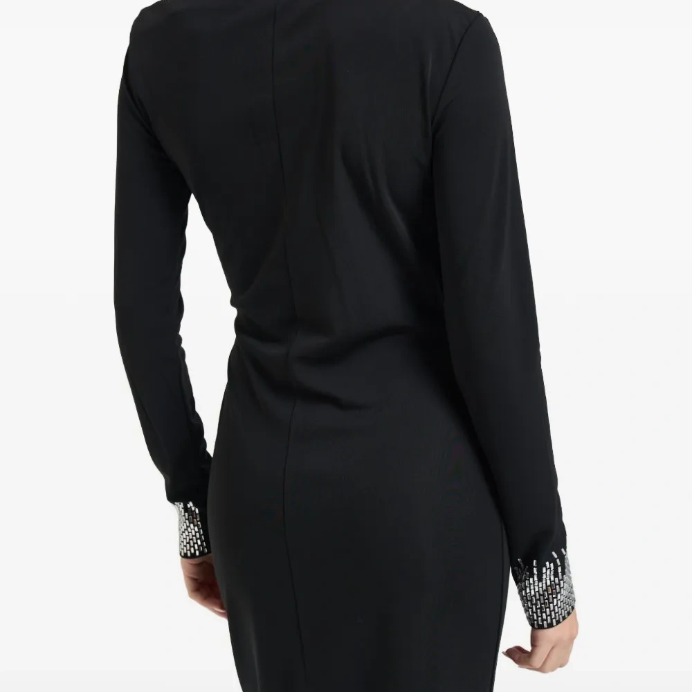 черные манжеты с бусинами, сборки, длинные рукава, круглый вырез, длина миди