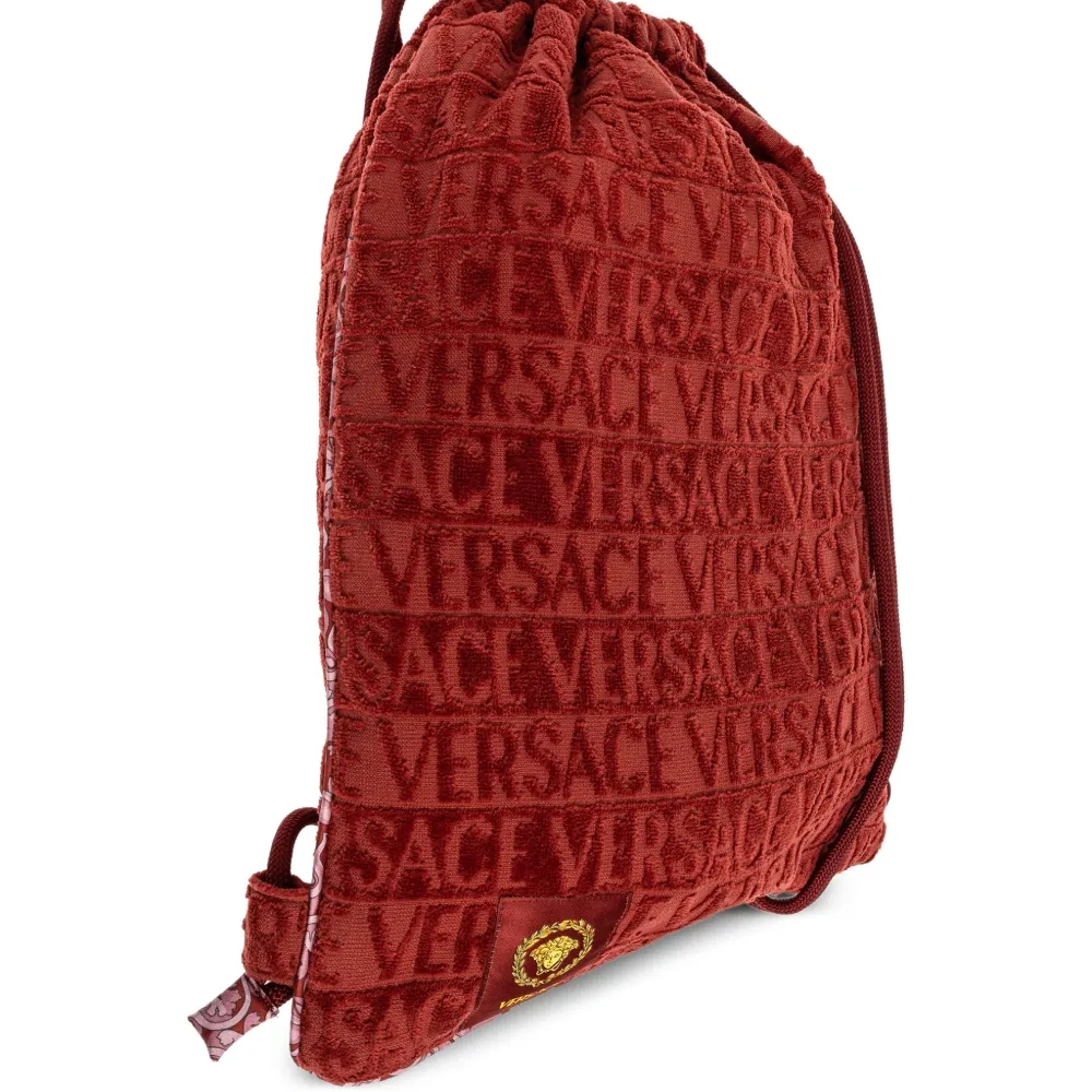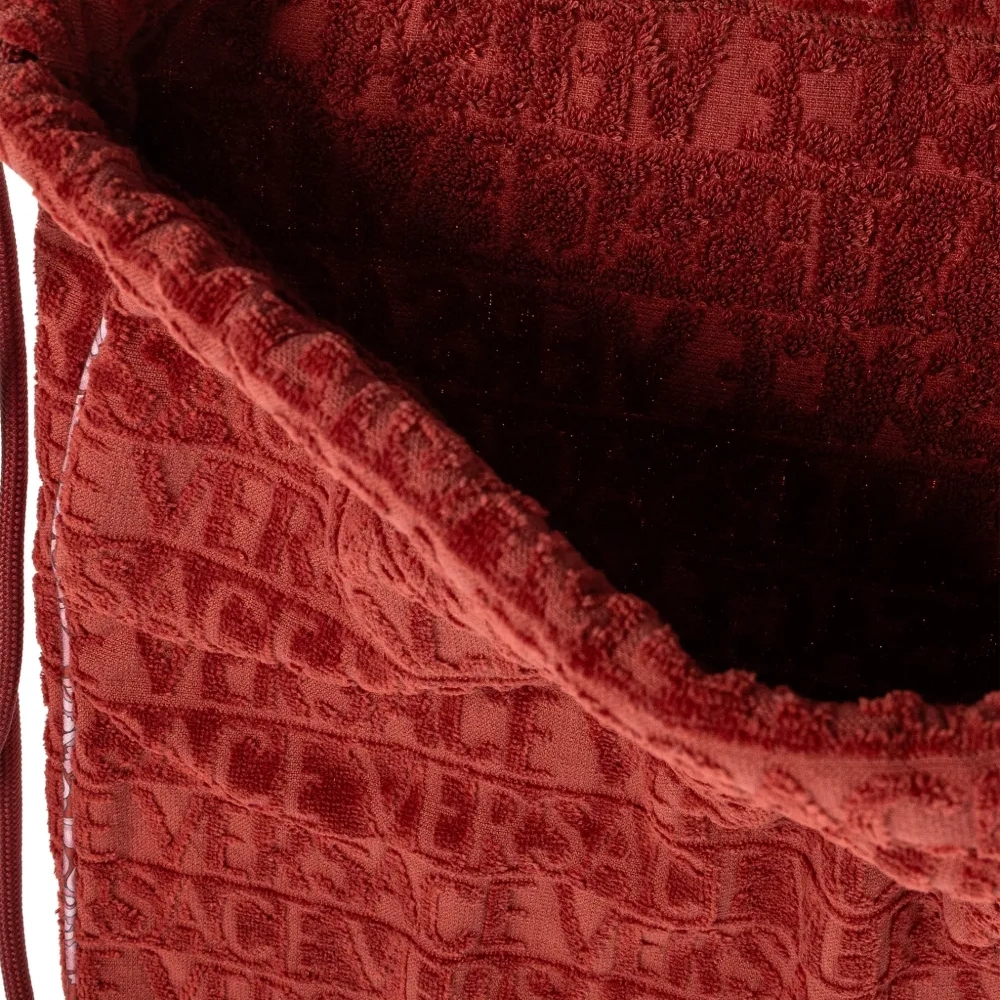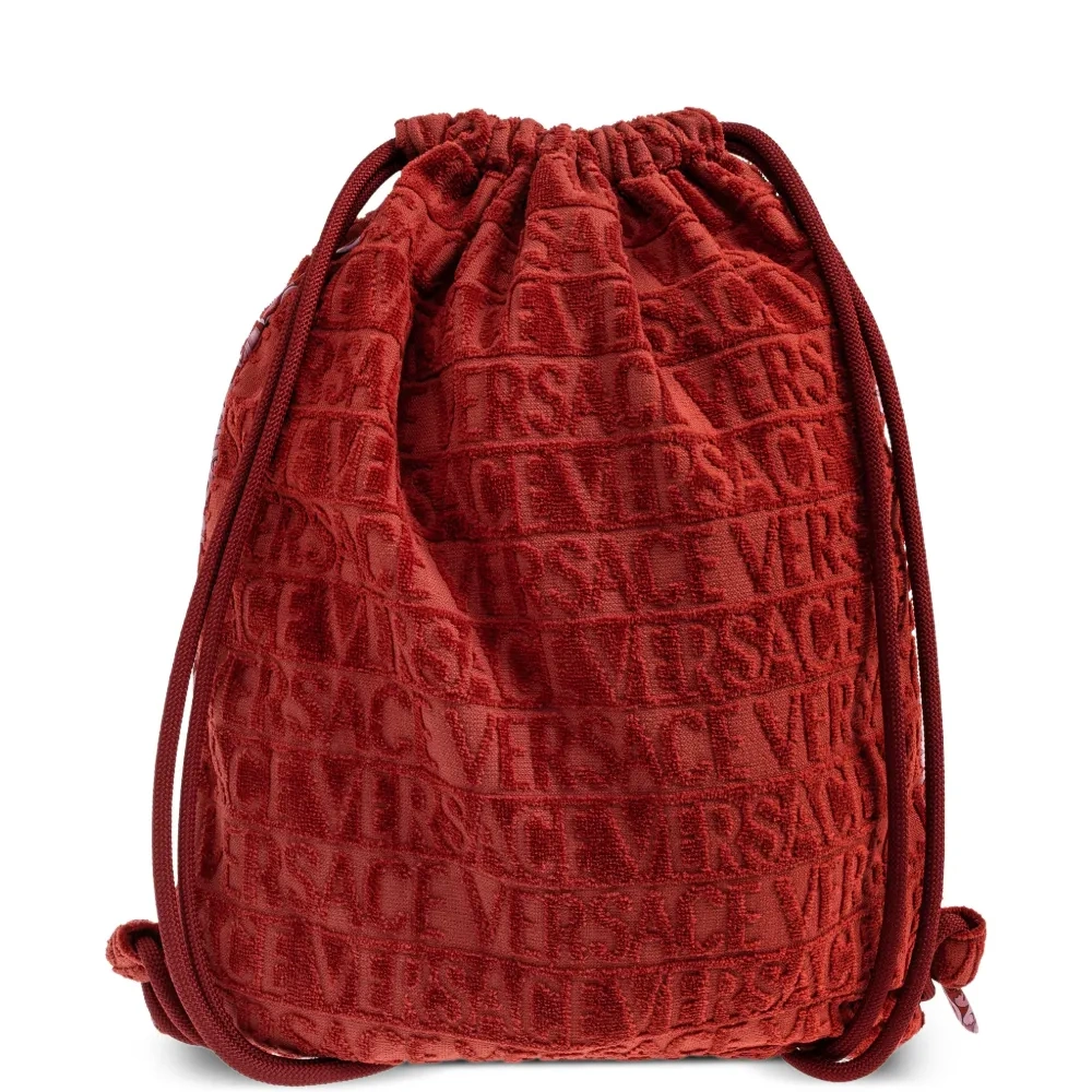 красный цвет, текстурированная отделка, надпись с логотипом, застежка-кулиска, плечевые лямки-веревки, тональная строчка